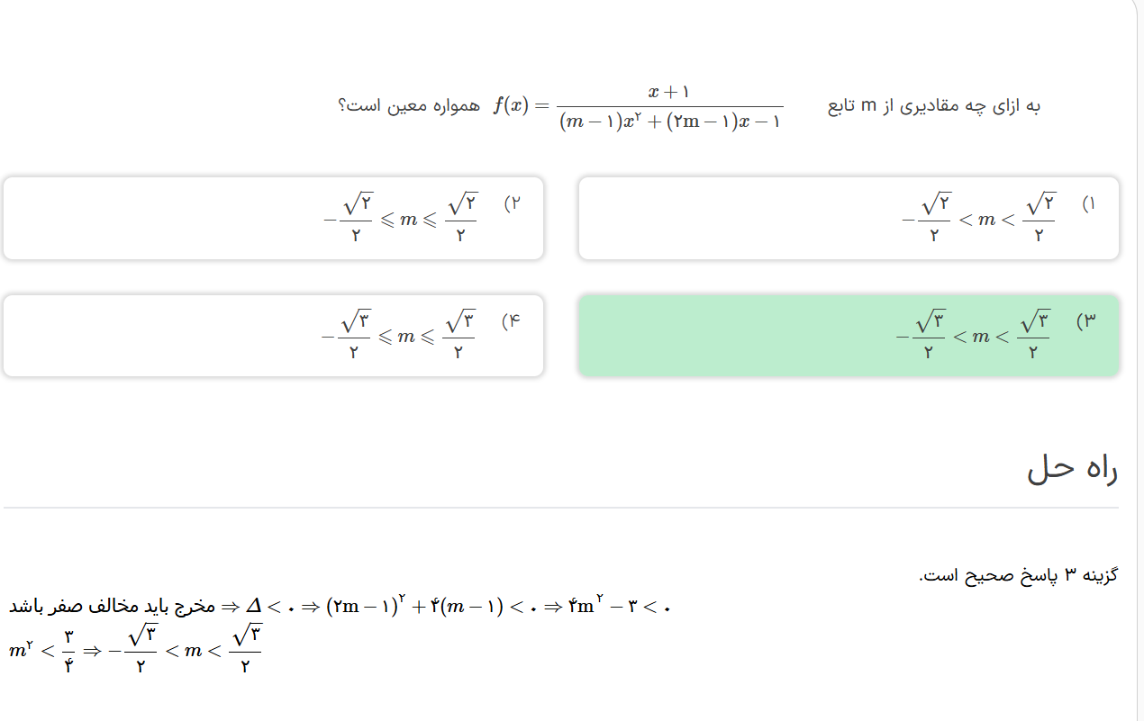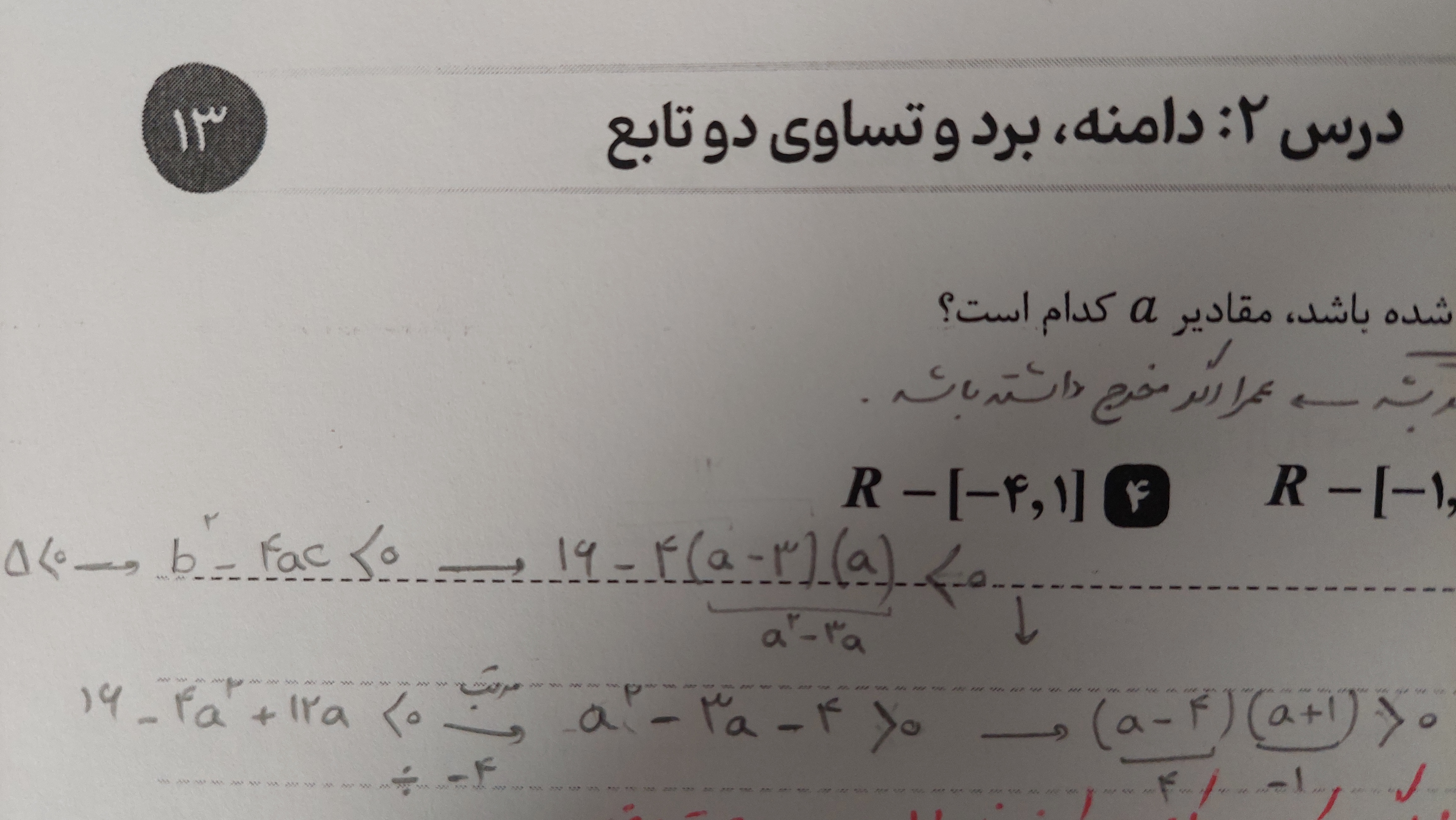 سلام تو سوال ۳ علت اینکه گزینه ی یک انتخاب نشد این بود که وقتی نامعادله رو حل کردیم علامت نامعادله عوض شد یعنی باید عدد هایی رو به جای aقرار بدیم که عبارت از صفر بزرگ تر بشه در این صورت دلتا از صفر کو چیکرتر و همواره تعریف شده خواهد بود اگر بجای a مثلا ۴ رو قرار بدید دلتا برابر با صفر میشه یا اگر اعداد منفی قرار بدید دلتا مثبت میشه اما اگر اعداد مثبت بجای a بگذارید و حساب کنید دلتا منفی در می یاد