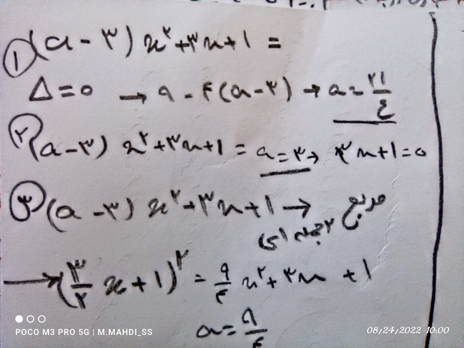 میشه گف باتوجه ب اینک در دوحالت ریشه یک عدد میشه(ریشه مضاعف و درجه یک)بدون محاسبه بگیم دوحالت داریم؟ ممکنه aیک حالت بده؟