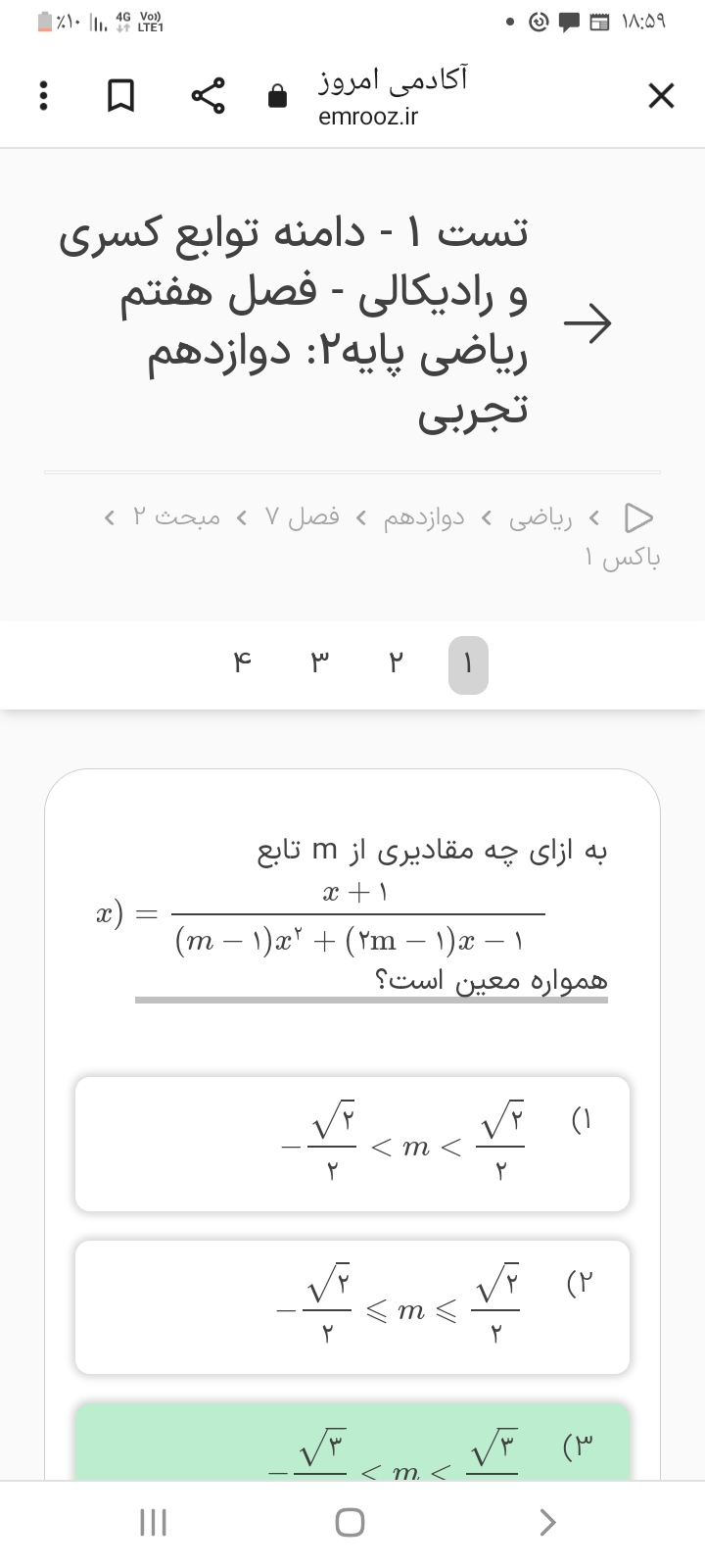 سوال گفته به ازای m مقادیری پیدا کنید که "همواره معین" باشد؛پس مخرج نباید ریشه داشته باشه و این یعنی دلتا منفی باشه پس در نتیجه با حل یه نامعادله و پیدا کردن ریشه ها و تعیین علامت ،محدوده m رو پیدا میکنیم🌺