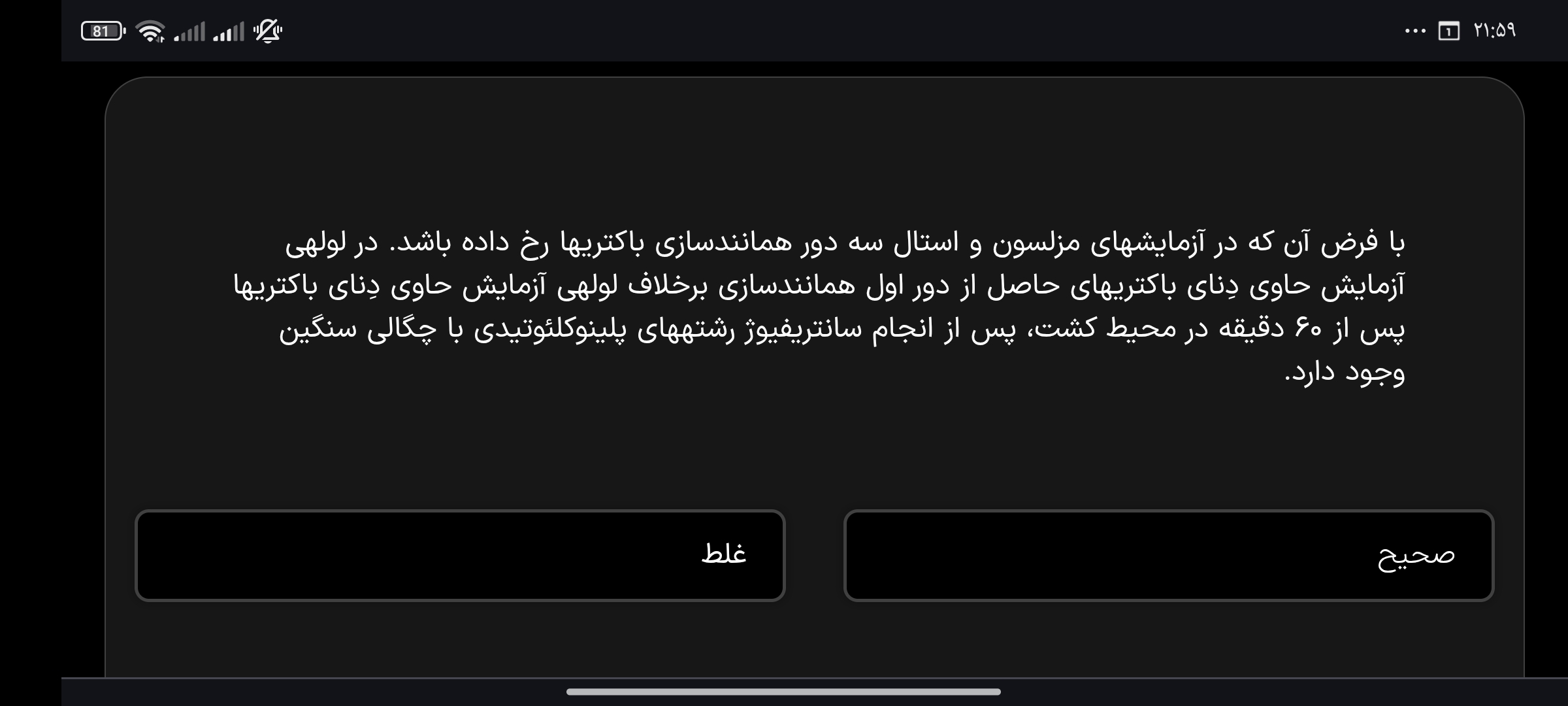 @Mohammad yasin Aryani نه منظور رو متوجه نشدید. ما میگیم یک دنای مادر داریم که مثلاً ۱۰ تا نوکلئوتید داره، دنا هم دو رشته داره،یعنی در هر رشته ۵ نوکلئوتید وجود داره. این دنای مادر با همانند سازی غیر حفاظتی به دوتا دنا تبدیل میشه. که هر کدوم ۱۰ تا نوکلئوتید دارند. و در هر رشته ۵ نوکلئوتید‌. هر نوکلئوتید قدیمی روبه روش یک نوکلئوتید جدید با پیوند هیدروژنی وجود داره. پنج تا نوکلئوتید در یک رشته وجود داره و پنج تا هم در رشته مقابل. ایشون سوال پرسیدن که تو هر رشته نیمی از نوکلئوتید ها کاملا جدید و نیمی از آنها کاملا قدیمی هستن. خب شما پنج تا نوکلئوتید توی یک رشته رو میتونی نصف کنی؟ ینی ۲.۵ تا نوکلئوتید جدید داریم ۲.۵ تا قدیم؟ خلاصه بگم، این سوال بستگی به زوج و فرد تعداد نوکلئوتید های هر رشته داره. مثلاً اگر نوکلئوتید کل دنا ۱۲ تا بود، توهر رشته میشد ۶ تا نوکلئوتید و اینطوری سه تا نوکلئوتید کاملا جدید بودن و سه تا نوکلئوتید کاملا قدیمی. اگر سوال بگه مثلاً در همانند سازی غیر حفاظتی یک مولکول دنا، با ۲۰ تا نوکلئوتید، قطعا نیمی از نوکلئوتید های هر رشته، جدید هستند و نیمی دیگر قدیمی. خب این درسته. چون توهر رشته ۱۰ تا نوکلئوتید هست که تقسیم بر دو کنی میشه پنج تا، یعنی پنج تا قدیم پنج تا جدید و اینطوری رشته مقابلش هم پنجتا قدیمی بود و پنج تا جدید. ولی اگر سوال می‌گفت یک مولکول دنا ۲۲ تا نوکلئوتید دارد، سوال غلط میشه، چون به تعداد مساوی در هر رشته نمیشه قدیم و جدید رو تقسیم کرد. توی هر رشته میشد ۱۱ تا نوکلئوتید ، که مثلا رشته سمت راست شیش تا نوکلئوتید قدیمی داشت که هر کدوم با نوکلئوتید رشته روبه رو پیوند هیدروژنی میدن، یعنی این شیش تا قدیمی سمت راست با شیش تا جدید سمت چپ پیوند میدن، پنج تا نوکلئوتید جدید رشته سمت راست با پنج تا نوکلئوتید قدیمی رشته سمت چپ پیوند میدن. امیدوارم که متوجه شده باشید. اگر باز متوجه نشدید بگید که من روی کاغذ براتون توضیح بدم❤️