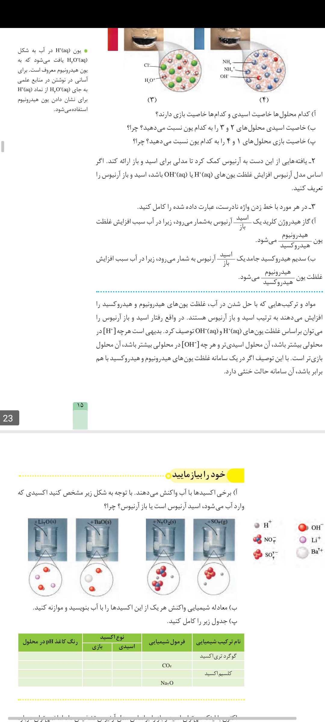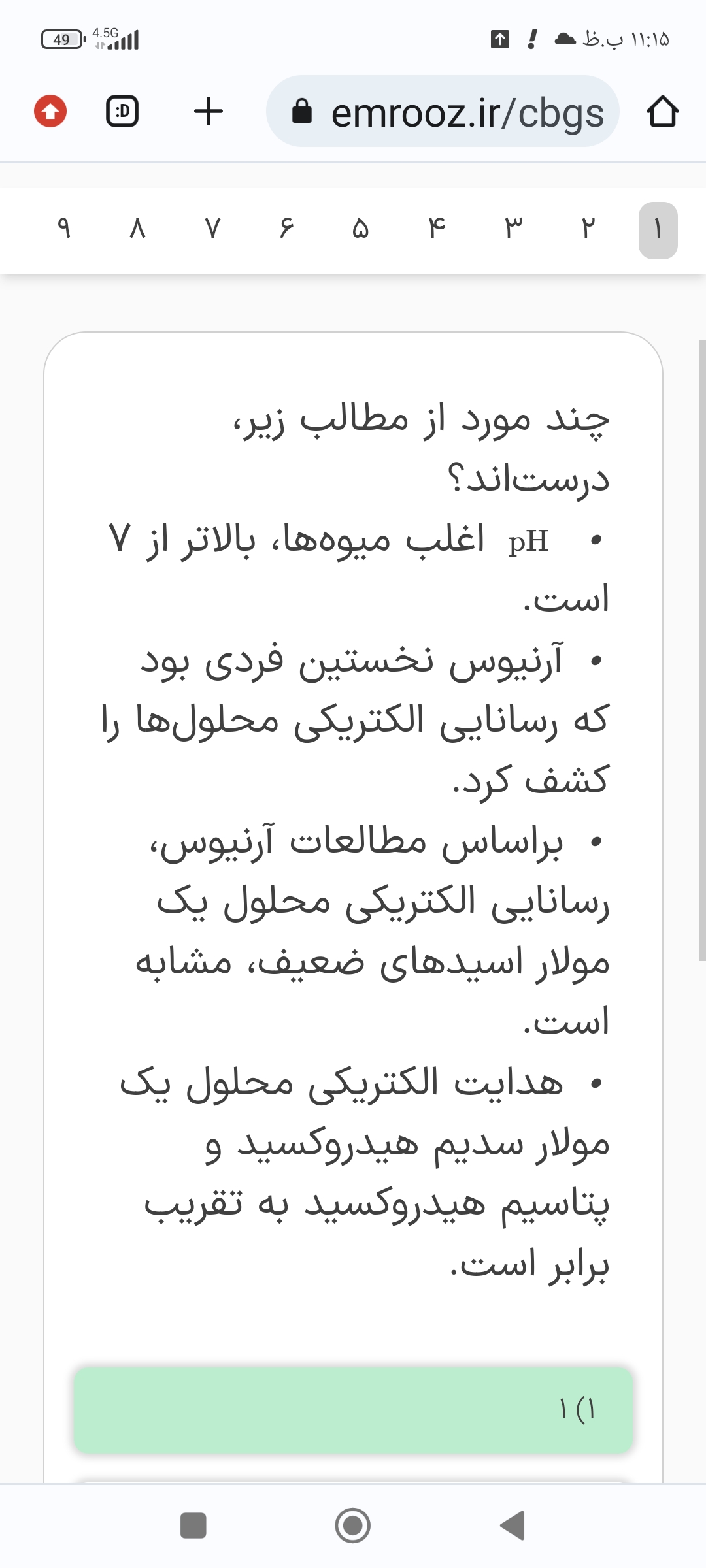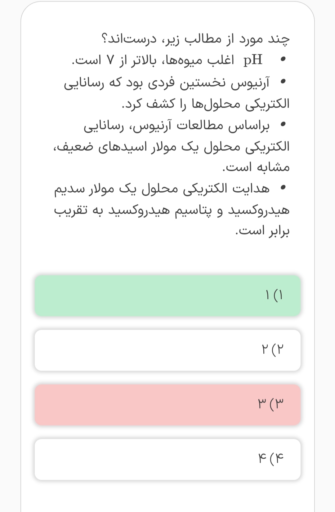 دوستان تو تمرین ۳ مورد پ :براساس مطالعات ارنیوس رسانایی الکتریکی محلول یک مولار اسید های ضعیف مشابه است غلط زده میخواستم ببینم اگر میگفت تقریبا برابر هست مثل مورد ۴ درست بود؟