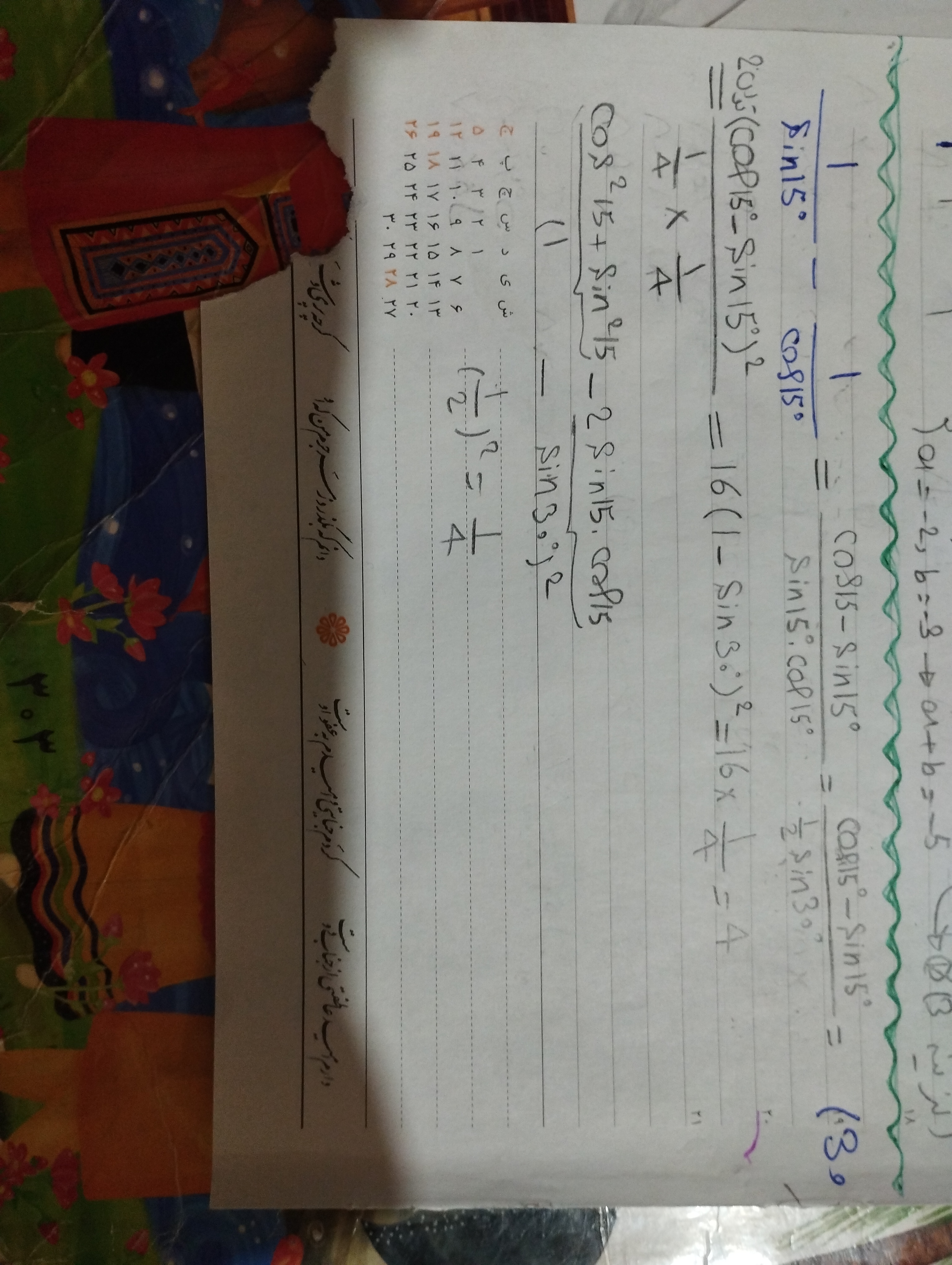 @ABOLFAZL Hendevani سلام مجدد وقتتون بخیر من حتما تا جایی که بتونم راهنماییتون میکنم اما اگر ممکنه سوالاتتونو در کامنت های جدید بزارید و رو قبلی ها ریپلای نزنید راجب راه حلتون اگر ما بخوایم صورت کسر رو به توان ۲ برسونیم میشه cos^2(15) + sin^2(15) - 2cos(15)sin(15) درسته ؟ که حاصلش میشه ۱ منهای سینوس ۳۰ درجه و در نهایت میشه ۱/۲ داخل مخرج هم ۱/۱۶ داریم که بیاد بالا میشه ۱۶ اگر ۱۶ در ۱/۲ ضرب بشه میشه ۸ درسته ؟ حالا شما به توان ۲ رسونده بودید وقتشه که ازش جذر بگیرید و رادیکال ۸ هم که همون ۲ رادیکال ۲ میشه :)