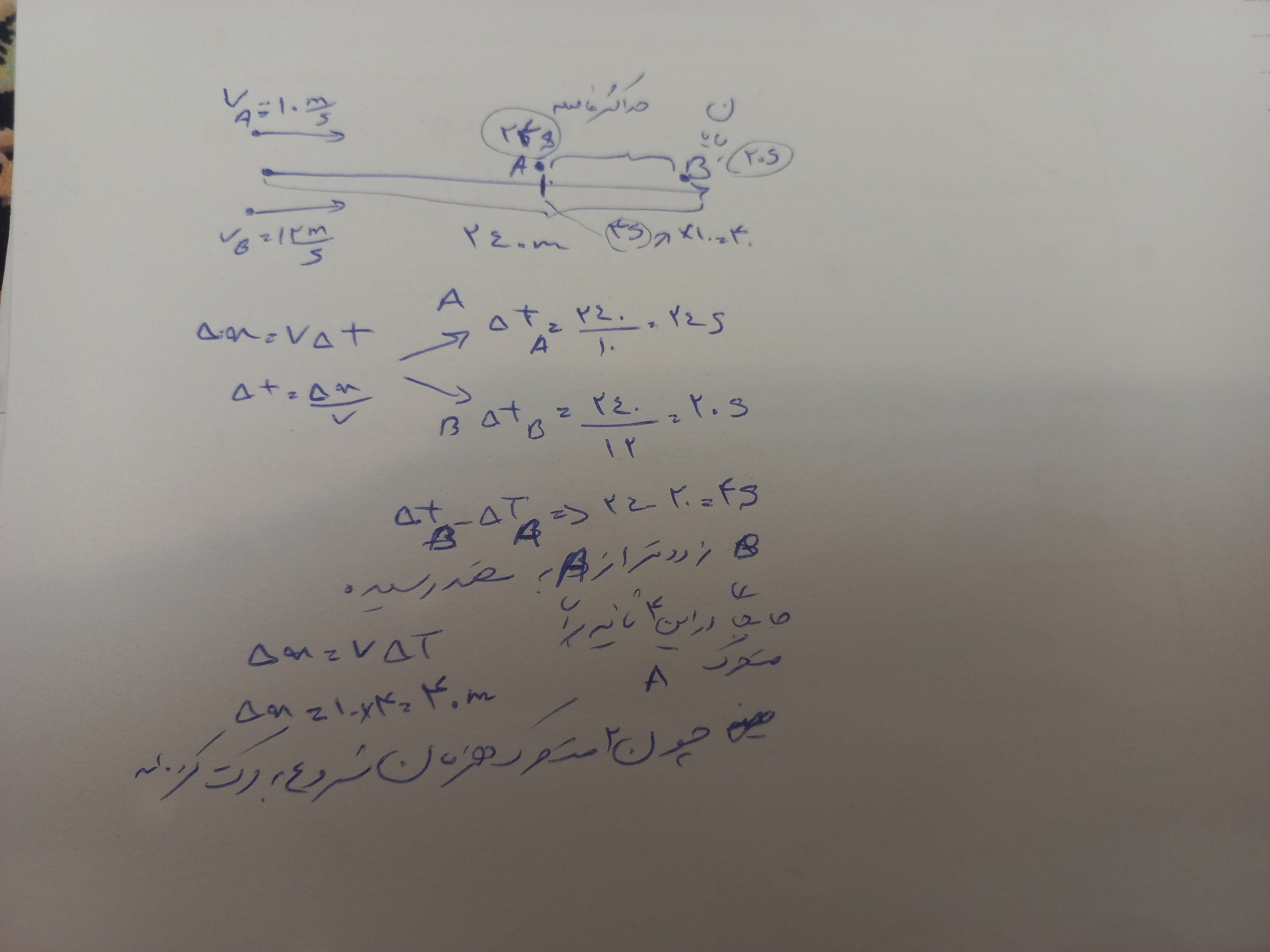 سلام حالا من اینجور گفتم که بیست ثانیه طول میکشه به مقصد برسه و تو هر ثانیه هم دو متر به نسبت متحرک اولی بیشتر جابجا میشه پس تو بیست ثانیه میشه چهل متر اختلاف