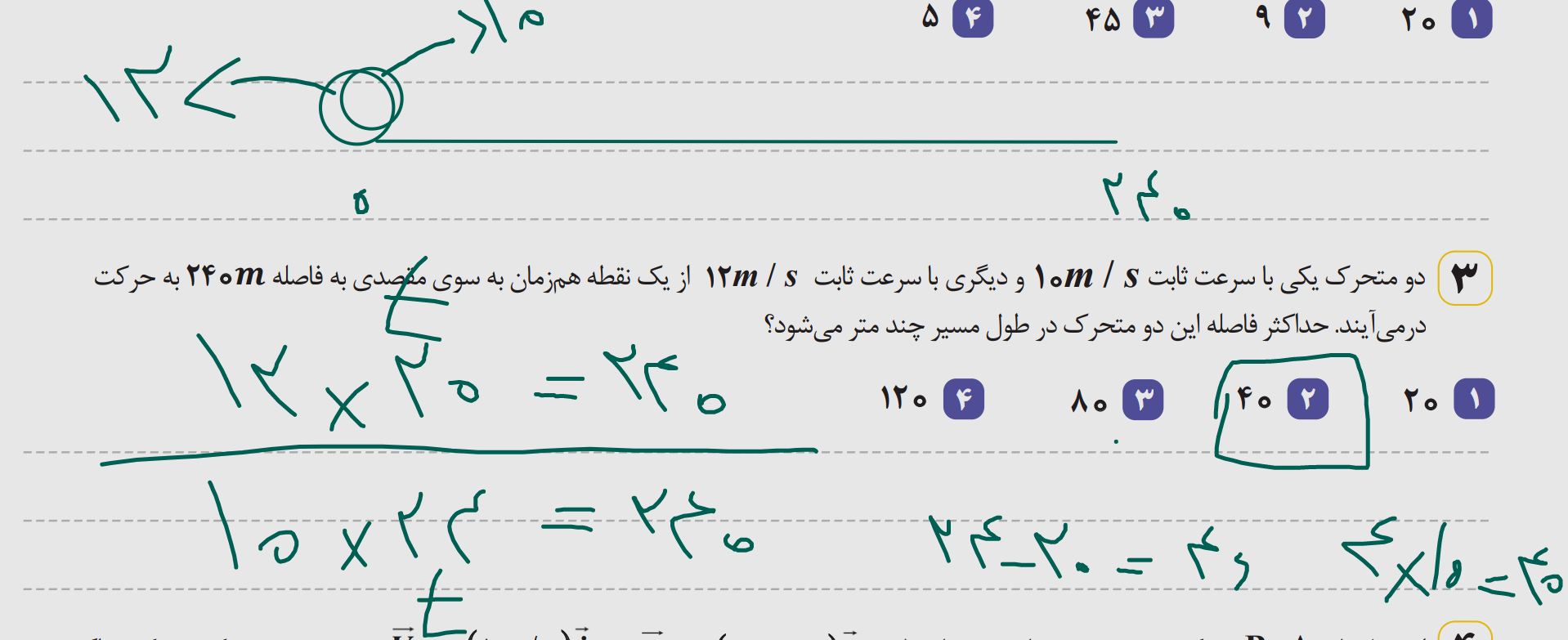 @مرتضی مرتضوی ببین دوست عزیز ما سرعت رو برای هر دو متحرک داریم از طرفی هر دو از یه مکان قراره شروع به حرکت بکنند و ۲۴۰ متر رو طی کنند خب حالا میبینیم هر کدوم در چه زمانی این مسافت رو طی کردن که میشه ۲۴×۱۰=۲۴۰ و ۱۲×۲۰=۲۴۰ خب طبق زمان هایی که بدست آوریم متحرک اول توی ۲۴ ثانیه این مسیر و رفته اما متحرک دوم توی ۲۰ ثانیه یعنی متحرک اول ۴ ثانیه زودتر حرکت کرده از مبدأ و توی هر ثانیه هم سرعتش ۱۰ هست پس ۴×۱۰=۴۰ پس کلا بیشترین مسافتی که میتونن داشته باشند ۴۰ تاس