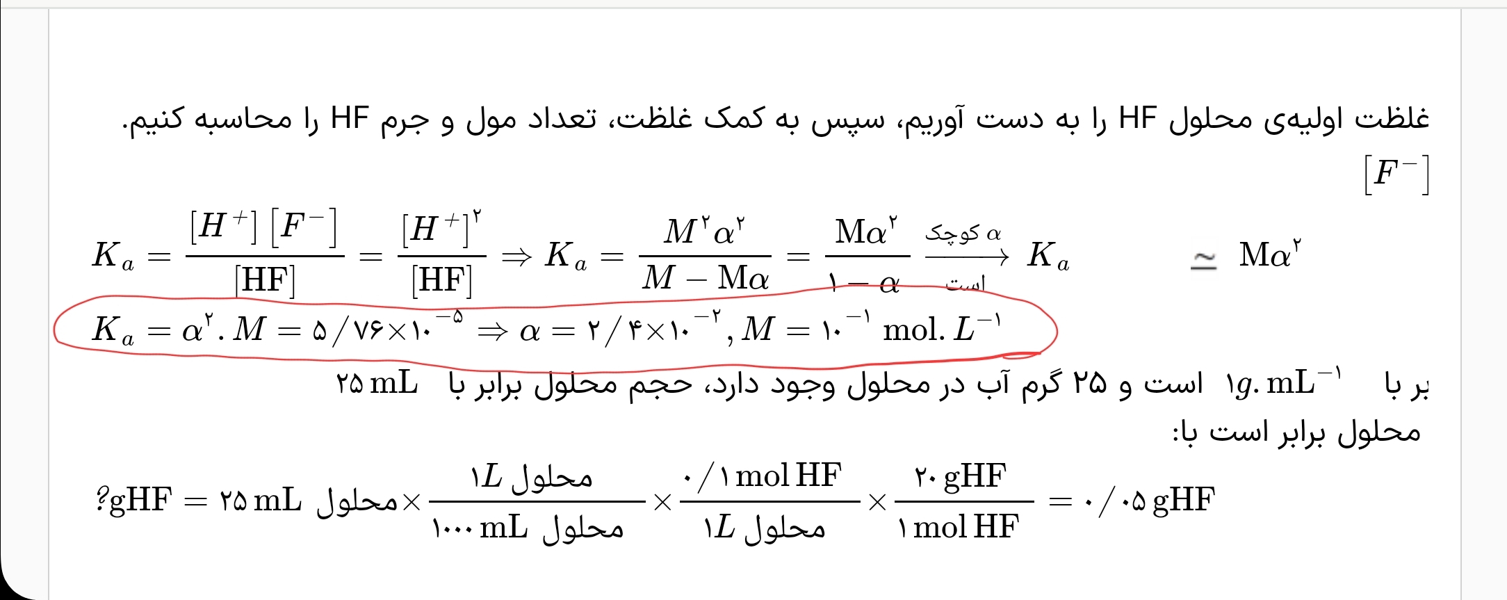 سلام چون اسید ضعیف هستش از فرمول ka=H+^2/M استفاده کردن H+ و F- هردوشون یک مقدار تولید. میشن و میتونن به جای هم تو محاسبه استفاده شن