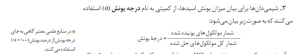 درصد یونش یعنی آلفا ضرب در ۱۰۰. ما توی سوالات نیاز به آلفای خالی داریم پس هرجا درصد یونش بهمون داده درصدشو نمیخوایم پس تقسیم بر ۱۰۰ میکنیم تا آلفای خالیشو بهمون بده. به عبارتی(آلفا میدن میگن درصدیونش بنویس خب آلفارو ضرب در صد می‌کنی تموم میشه. حالا بر عکسش درصدیونش میده آلفا میخواد خب تقسیم بر صد و تموم)