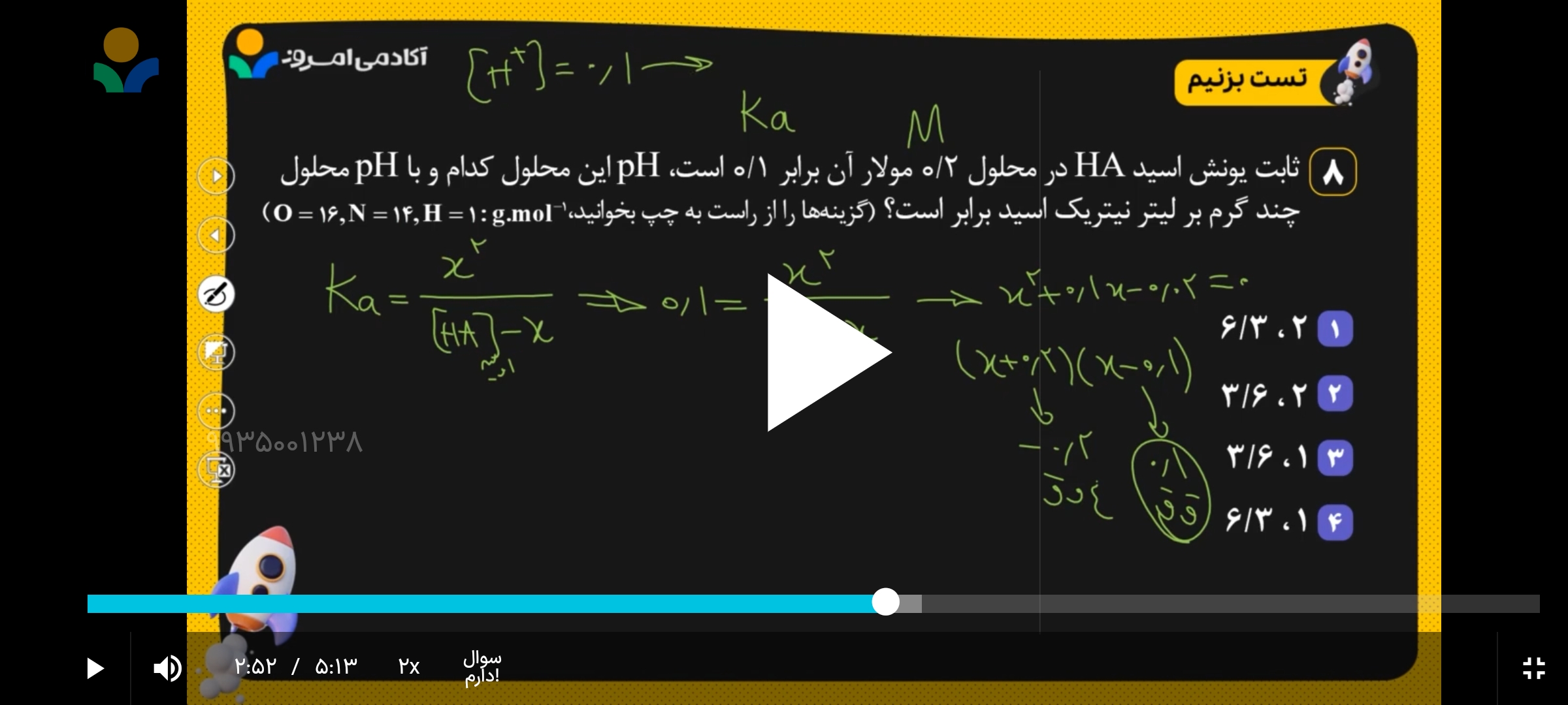 جایی که غلظت تعادلی رو داده بود، همون رو بزار تو مخرج. جایی که غلظت اولیه رو داده بود HA]-X]. ما باید در مخرج غلظت تعادلی HA رو بزاریم. ولی مسئله به ما غلظت اولیه HA رو داده. پس برای محاسبه غلظت تعادلی، باید غلظت اولیه رو منهای غلظت تعادلی H می‌کنیم. مثلا اینجا اول 0/2 مول HA تو آب ریختیم. ۰/۱ مول HA، به H+ و A- یونیده شدن، و بعد از تعادل، فقط ۰/۱ بصورت مولکولی یعنی HA باقی‌ موند. پس غلطت تعادلی HA (غلظت بعد از تعادل) میشه ۰/۱. ۰/۱=۰/۱_۰/۲