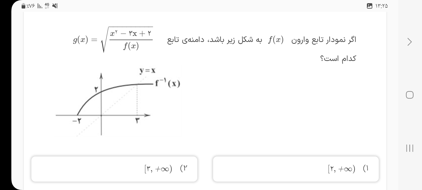 سلام برای اینکه تابه f رو پیدا کنی باید این نمودار رو نسبت به خط y=x قرینه کنی اون ضابطه که توی شوال نوشته، مقدار زیر رادیکال باید بزرگتر از صفر بشه و مخرج هم صفر نشه حالا باید تعیین علامت کنی هر کدوم از عبارات رو و مقادیر قابل قبول رو حساب کنی