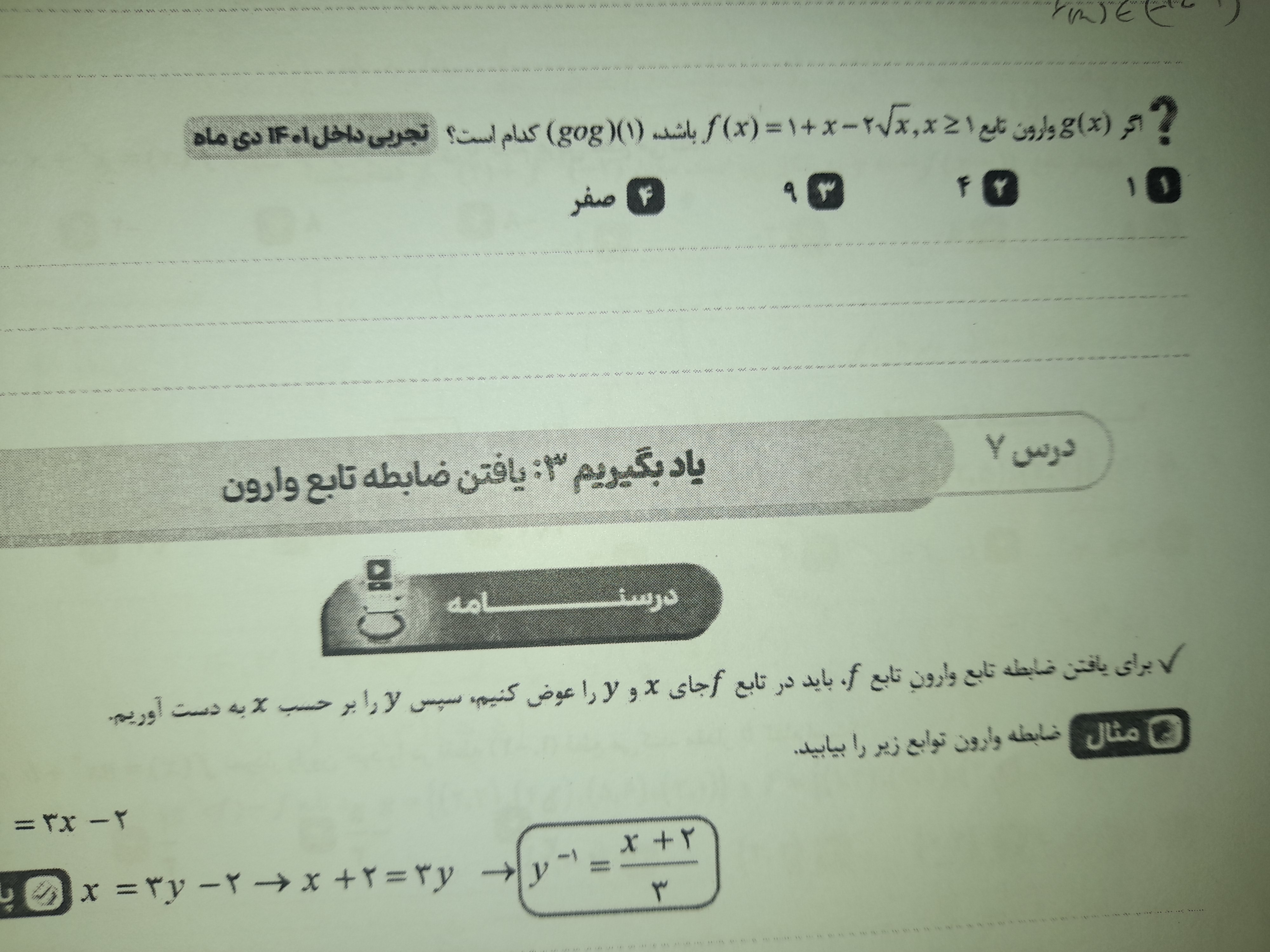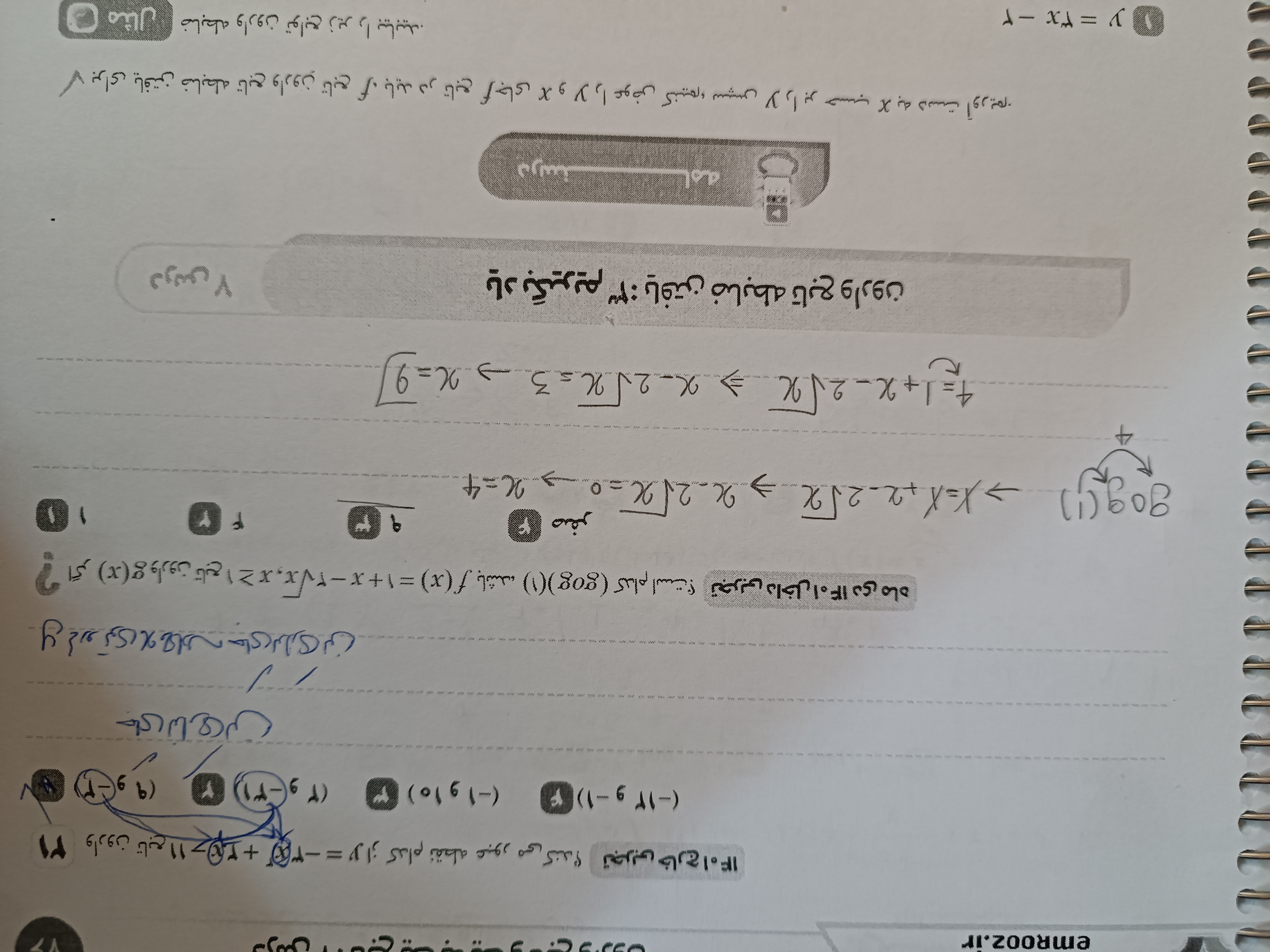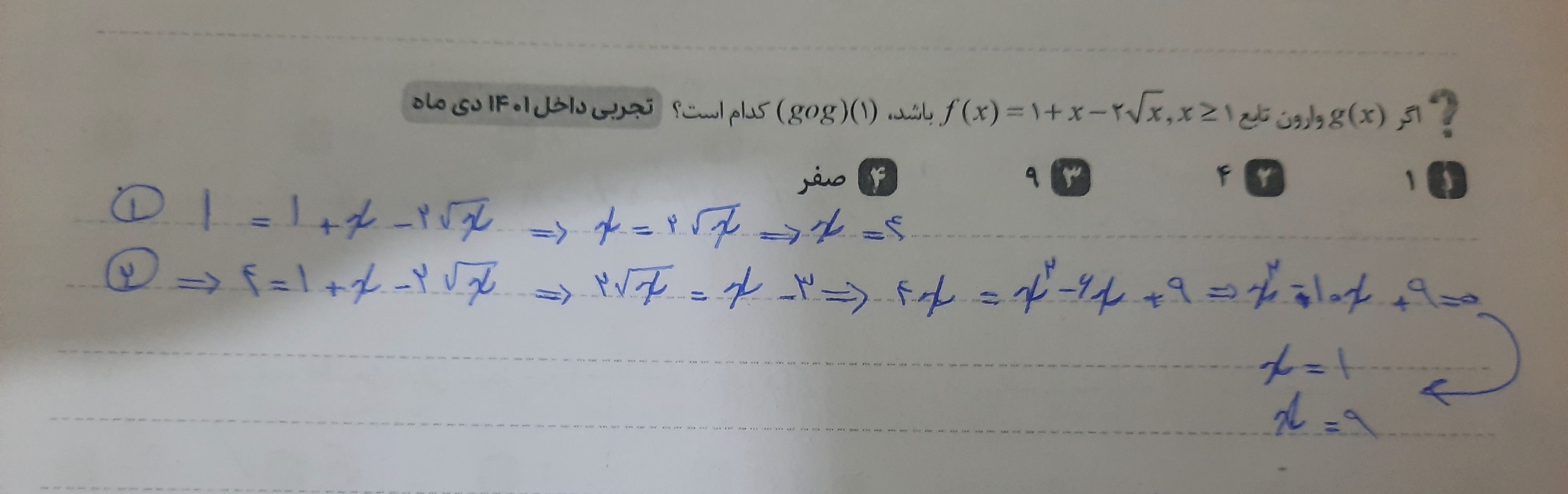 سلام ببین دوست من رادیکال محدودیت دامنه داره پس اگه در سوالی که حل کردی رادیکال داشت در آخر بهتره یه تست انجام بدی ببینی جوابی که بدست آوردی درسته یا نه در اینجا مراحل رو شما کاملا درست رفتین اما میبایست در مرحله آخر ایکس هارو در تابع اصلی بگذارید ببینید برابر ۴ میشود یا نه که در این صورت فقط ایکس مساوی ۹ درست خواهد بود موفق باشین