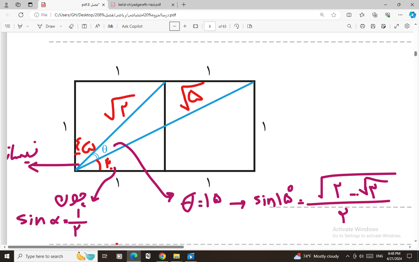 @نرگس رحیمی سلام وقت بخیر چجوری sin تتا رو 5√/2 بدست اوردیم