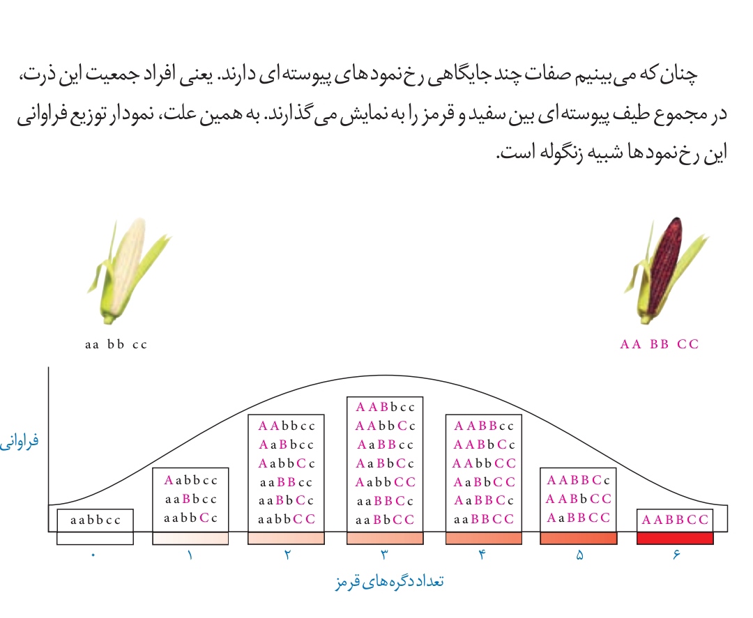 @سید محمد متین رشادی سلام ذرت یک نوع صفت چندگاهی هست و فنوتیپ های ان به شکل گسسته است و نمودار توزیع فراوانی فنوتیپی ان هم به شکل زنگوله است پس یک صفت پیوسته نیست