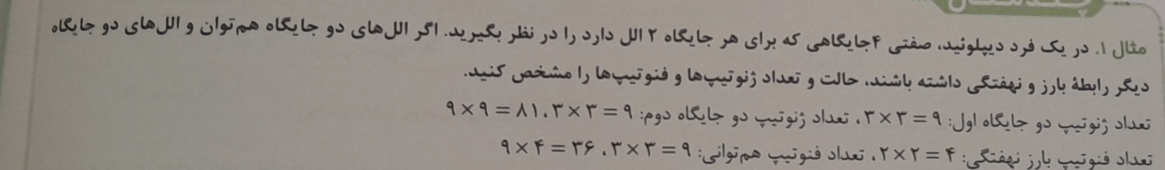 سلام ببین در صفحه 45،اون نمودار و دقت کنی،اونایی که در یک ستون قرار دارن،همرنگ هستن و تعداد دگره های بارزشون بیشتره و هرچی تعداد دگره های بارز بیشتر باشه ،پررنگ تره نمیدونم دقیقا کدوم قسمت رو گفتی