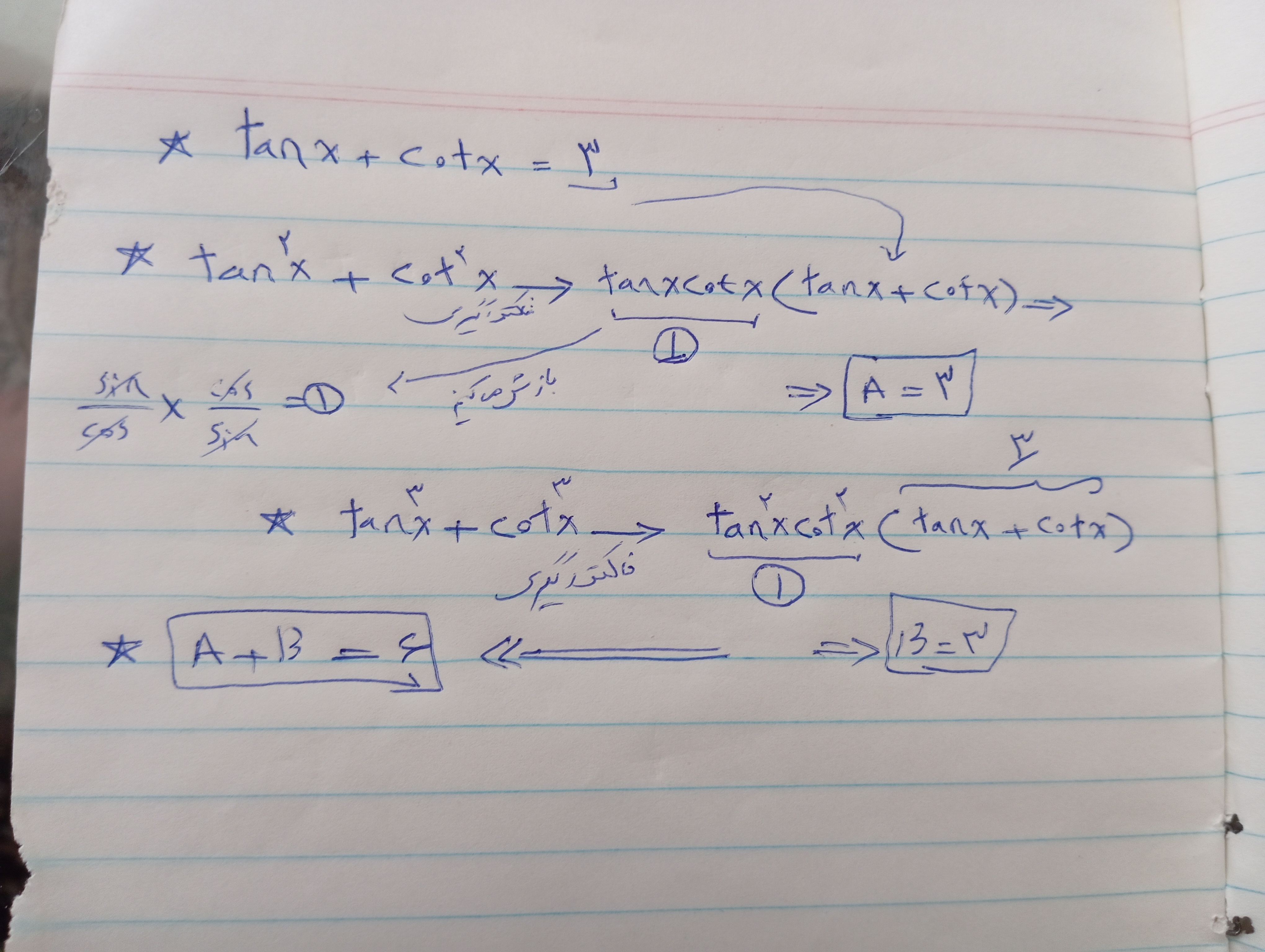 سلام جمع تانژانت و کتانژانت رو s در نظر گرفتن و ضربشون رو p و این ها رو جایگذاری کردن که عبارت های AوB رو حساب کنن حواسمون باید به این باشه که ضرب تانژانت و کتانژانت یه زاویه همیشه یکه(بجز ۹۰ درجه)