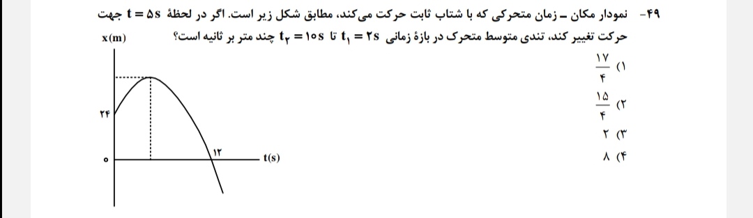 @هانیه بختیاری اگه توی نمودار دقت کنید متحرک درلحظه 10ثانیه در24متری هست ودر لحظه 12ثانیه درمبدامکان قرار داره بااین اطلاعاتی که گفتم میتونی راحت شتابو بدست بیاری که میشه 2متربرمربع ثانیه بعدش بااستفاده از شتاب سرعت اولیه رو بدست میاری وبقیش هم روتین هس وجوابت رو بدست میاری امیدوارم متوجه شده باشین وجواب نهایی تون باید گزینه1 دربیاد اگه جایی رو متوجه نشدین بگین تاتوضیحات لازم رو بدم خدمتتون