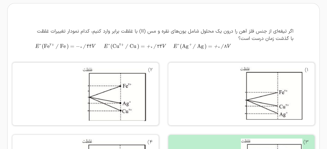 سلام اینجا جواب نباید گزینه 1 باشه چون تو کل محلول به ازای هر دو یون آهن که تولید میشه دو تا یون نقره و یک یون مس مصرف میشه پس شیب آهن و نقره باید یکی باشه ولی تو گزینه سوم برا هر واکنش رو تنها نشون داده یعنی گفته به ازای هر یک یون آهن که تولید میشه دو تا نقره مصرف میشه و تو واکنش بعدی هم دوباره یدونه یون مس مصرف میشه و یدونه هم یون آهن تولید میشه ولی نباید مجموع دو واکنش رو رسم کنیم چون داریم تو کل محلول بحث میکنیم