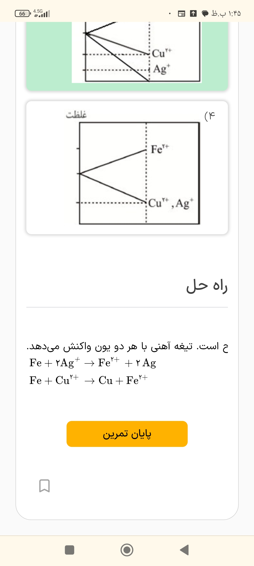 سلام ببخشید درباره تمرین آخر این بخش چرا نمودار سوم درسته؟نباید اولی باشه؟چون به ازای مصرف ۱ مول Cu2+ یه مول Fe2+ تولید میشه دیگه ولی نمودار سومی فاصله هاش درست نیست