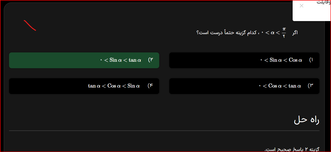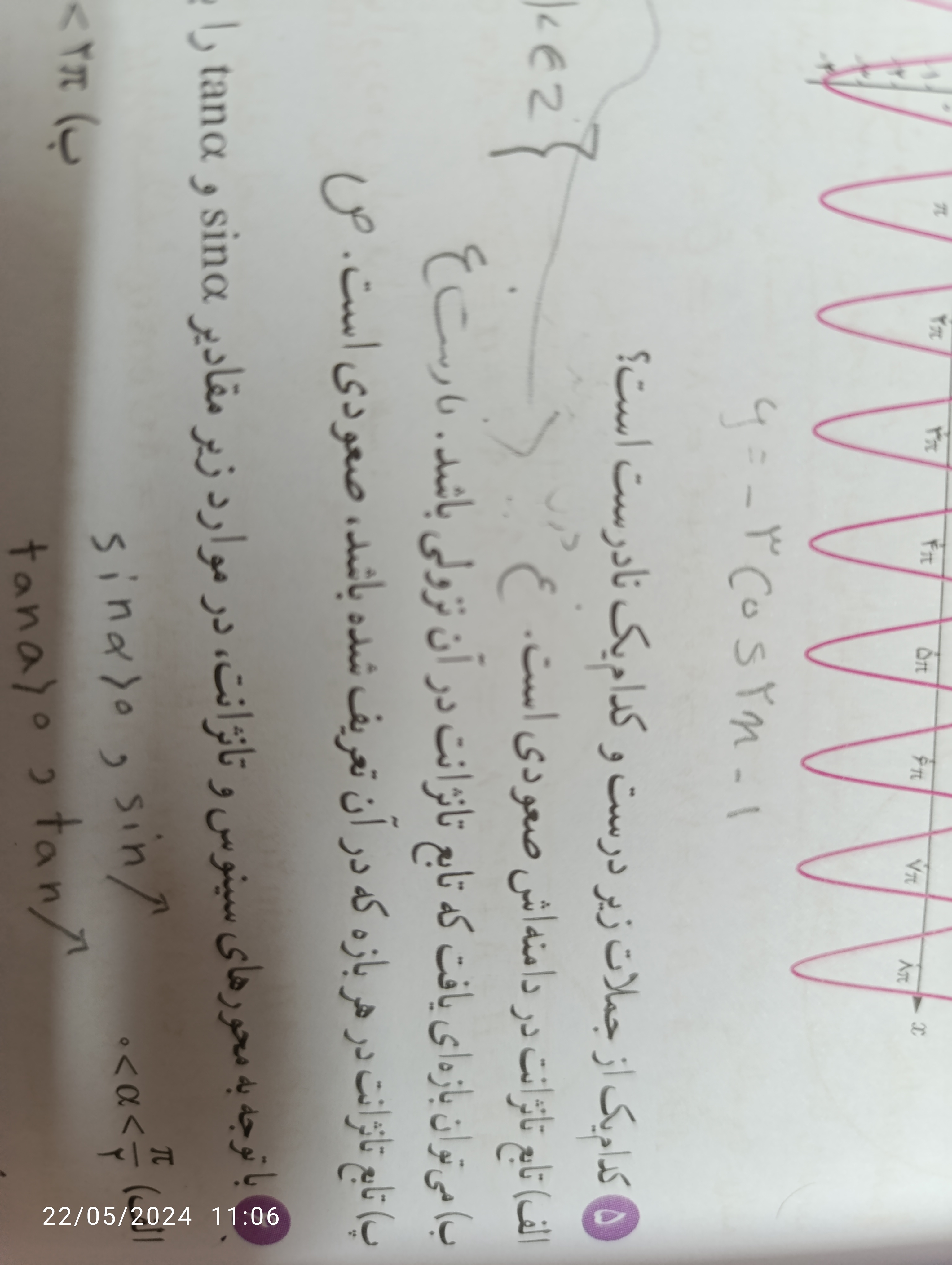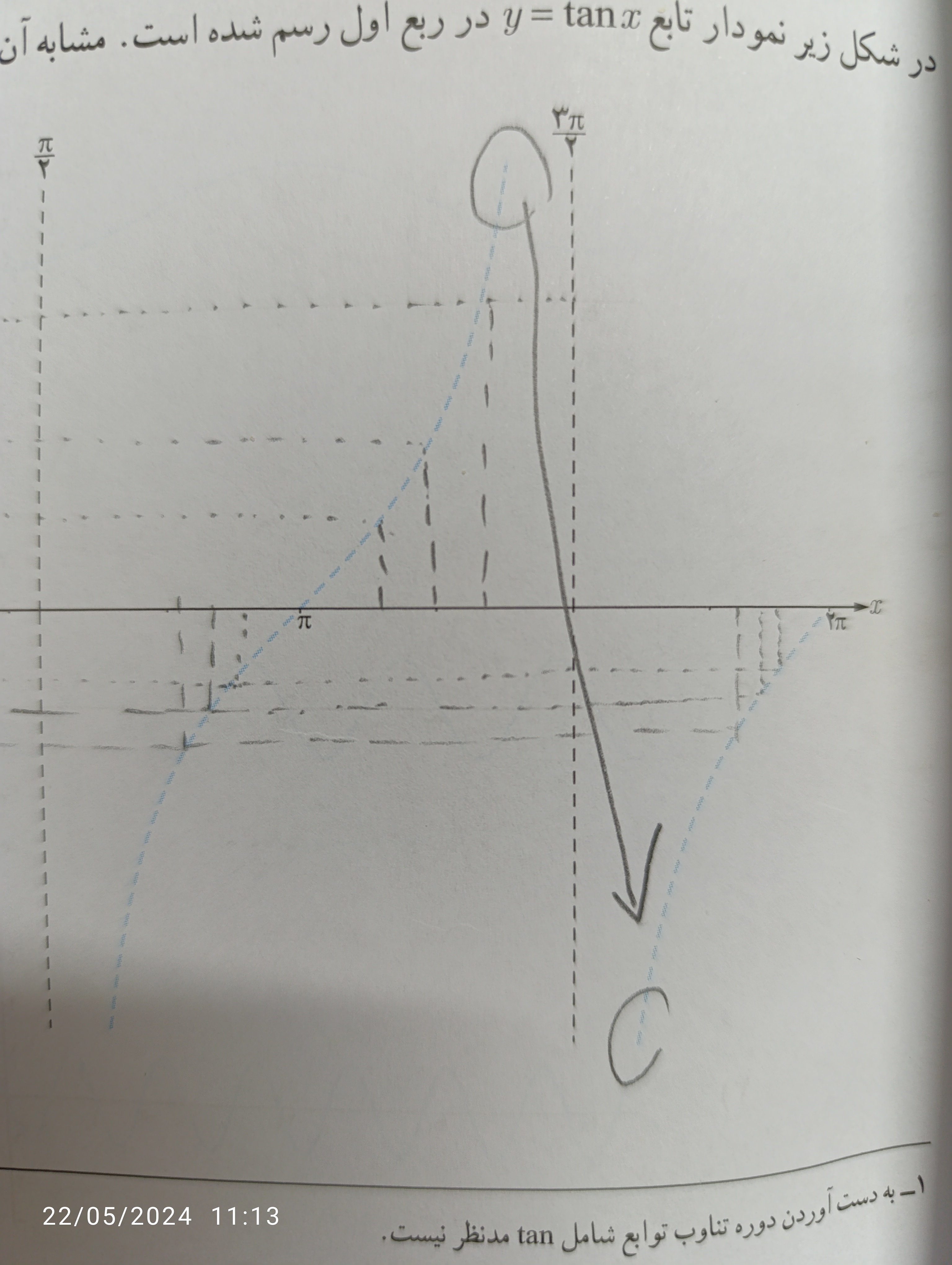 سلام وقتتون بخیر امکانش هست بگید چرا در چی یاد گرفتی اولی جواب گزینه یک نمیشه؟تانژانت ۳۰ درجه رو مگه نباید منفی در نظر گرفت پس چرا جواب گزینه دو میشه و همچنین در سوال دوم چی یادگرفتی مگه دوره تناوب تابع مون دو پی نیست؟ پس چرا بازه اکیدا صعودی بودنش از منفی پی تا مثبت پی؟