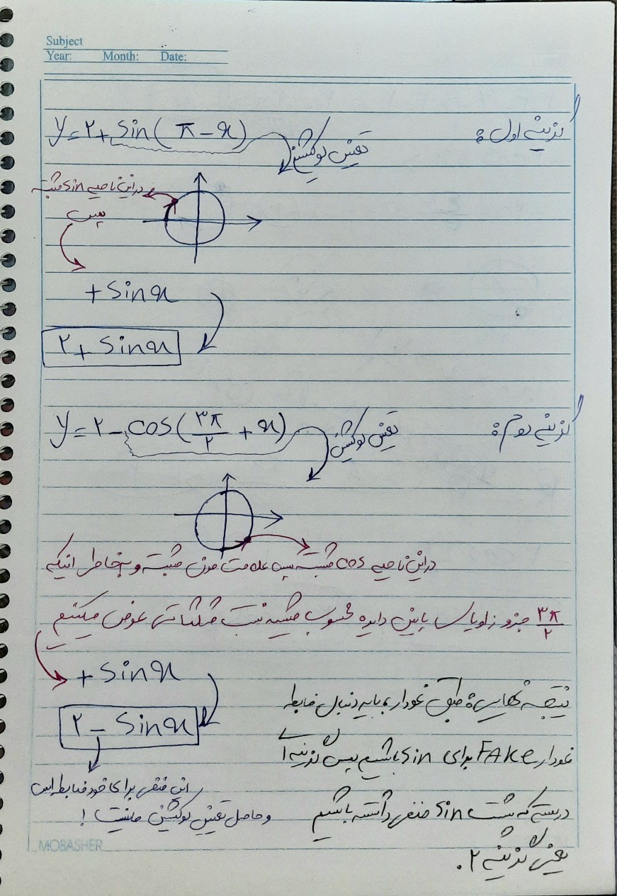@محدثه اباذری سلام ببخشید ی سوال داشتم چرا چی یاد گرفتی 2 میشه گزینه 2 ؟ خود استاد دارن میگن محور Y رو نزولی قطع میکنه کسینوس ک محور y قطع نمیکنه میشه گزینه ۱ درسته ؟