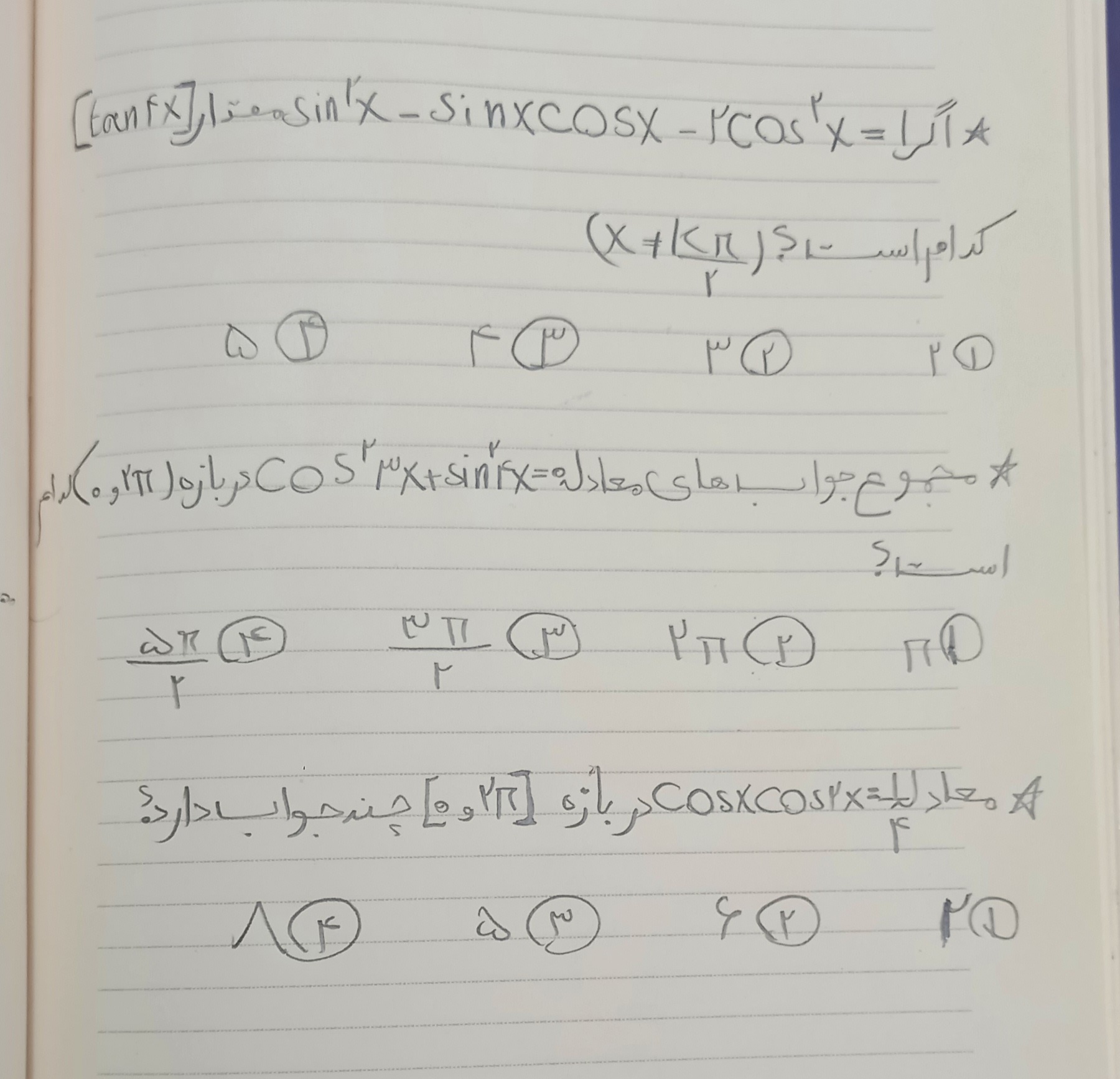 من این سوال رو با برابر گرفتن sin 2x با 2 بر روی tg+cot حل کردم ولی پاسخ یکی نشد.مرز چپ و راست دایره تو جواب هام نبود؟چرا؟