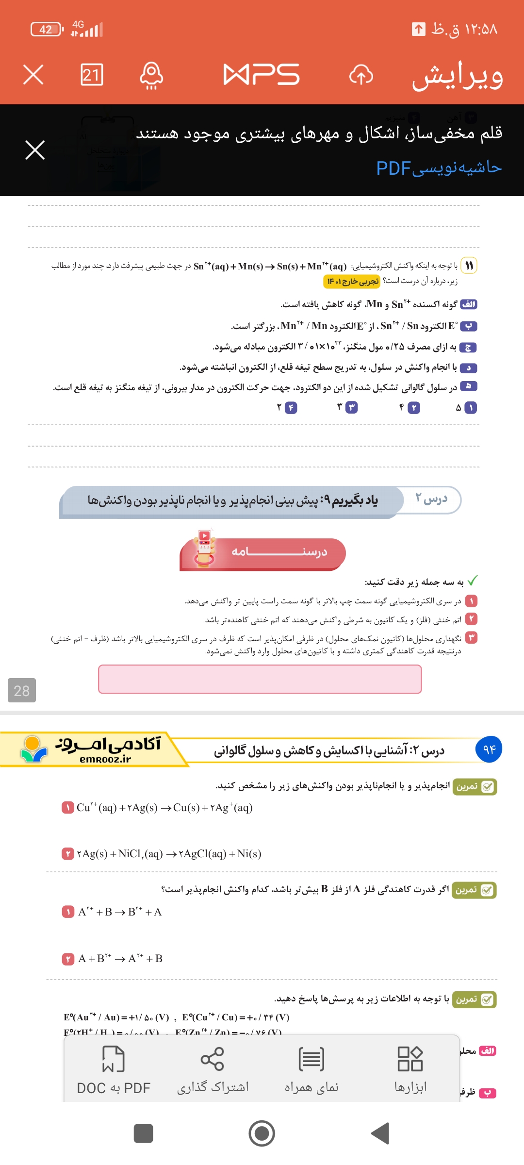 درود بر شما.. خسته نباشید.. ببخشید..مگه استاد نگفتن ما در یک واکنش هم باید اکسایش داشته باشیم هم کاهش؟ پس چرا برای واکنش اول هردو نیم واکنش رو نیم واکنش کاهشی نوشتن؟ متوجه نشدم این قسمت رو..
