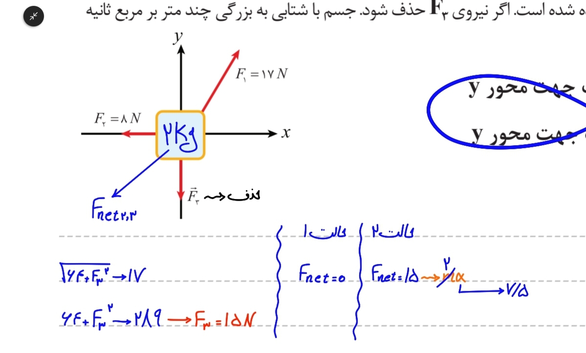 ببین نیروی سوم که حذف بشه یه نیرو به طرف بالا میمونه ۱۵ نیوتونی نیروی سمت چپ و راست که با هم خنثی میشن پس جسم به طرف بالا حرکت میکنه