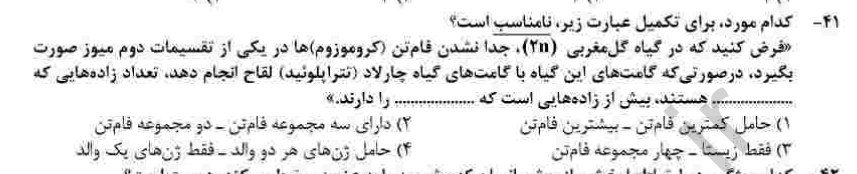 @مهلا جعفری گزینه یک . زاده هایی با کمترین فامتن میشه یدونه 2n زاده هایی با بیشترین فامتن میشه یدونه 4n گزینه یک نامناسبه چون تعداد زاده هایی که خواسته برابر هستند . تست هم گزینه ای رو میخواست که نامناسب باشه ... اون تصویری که خانم مهدوی فرستادن هم همینو نشون میده .