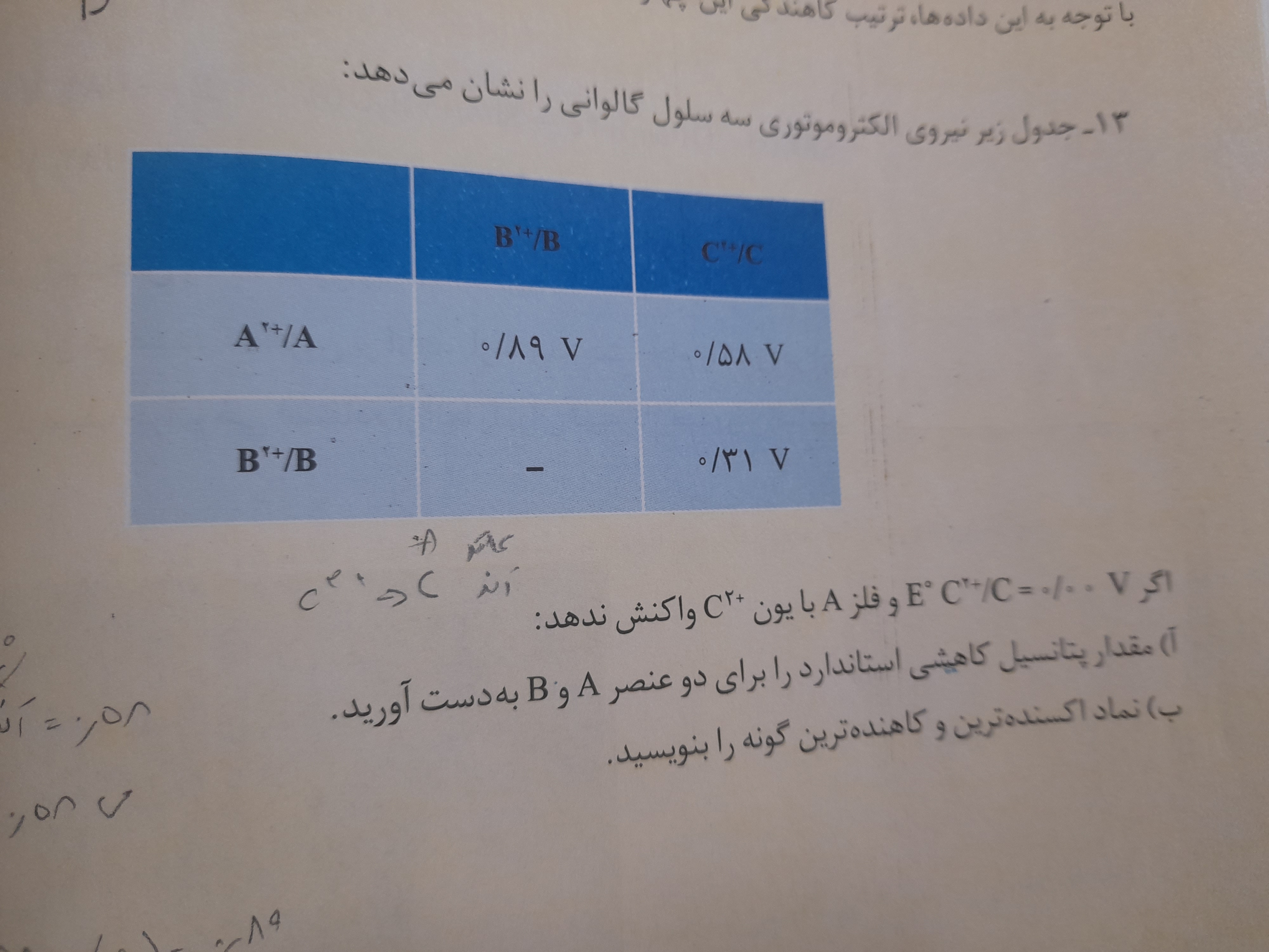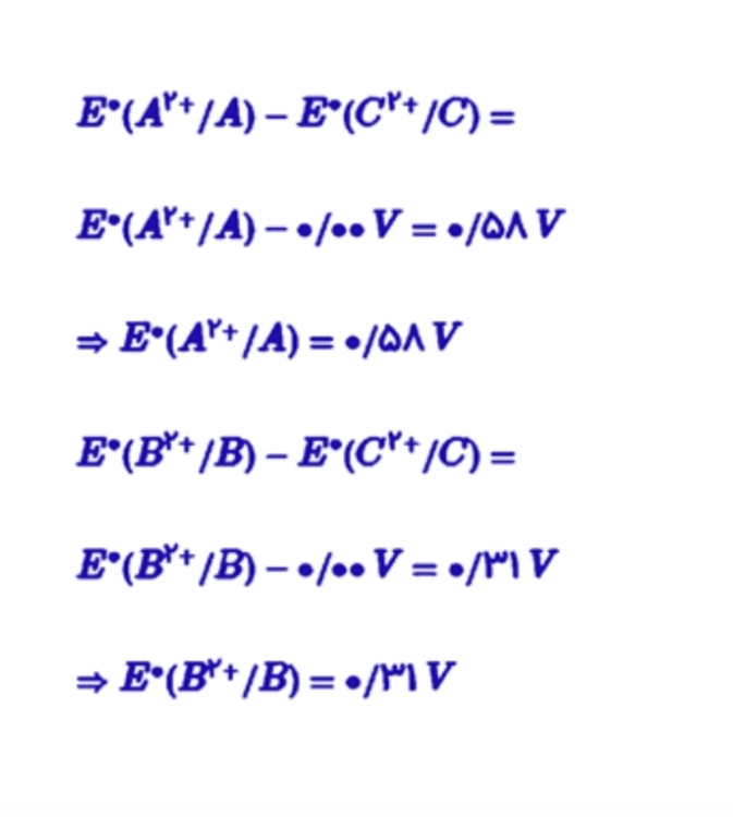 چون گفته A. با یون C واکنش نمی‌ده ینی A اکسنده تر از C هست و در نتیجه A میشه کاتد حالا محاسبه‌اش اینجوری میشه: