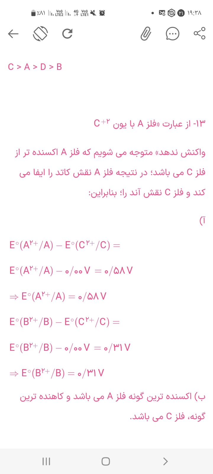 @زینب مقدم سلام خسته نباشین میشه این سوال تمرین دوره ای رو یه توضیح بدین مورد آ گفته مقدار پتانسیل کاهشی هارو بدست بیارید خب ما واسه ی فلز A و c از صورت سوال چون گفته واکنش نمیده متوجه شدیم کدوم کاتد و کدوم آنده اما واسه فلز B ک نمیشه تشخیص داد اینو اگه B رو کاتد بگیریم میاد مثبت اگه آند بگیریم مقدارش منفی میاد پس تو قسمت ب از کجا بعدش بفهمیم ک کدومشون کاهنده تر بوده کدوم‌اکسنده وقتی از Bاطلاعی نداریم بین این ۳ تا وقتی اطلاعاتی نداده