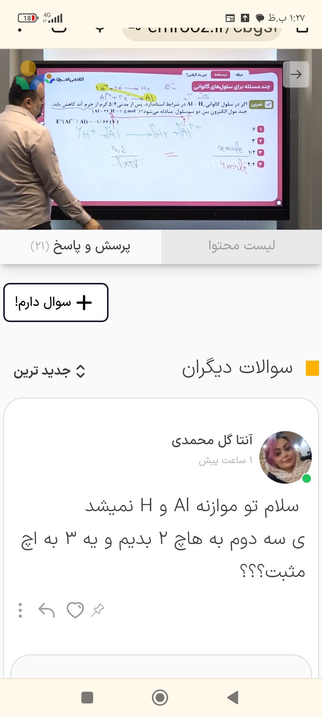 سللام.نیم واکنش کاهش هیدروژن رو ضرب در 3میکنیم...نیم واکنش اکسایش آلومینیوم رو صصرب در 2...موازنه تعداد الکترون هاست در اصل چون زمانی از روی دو تا نیم واکنش ما یه واکنش کامل رو مینویسیم ک الکترون هاش موازنه و برابر باشند...که در این سئال الکترون مئازنه شده میشه 6...تعداد الکترون مبادله شده هم میشه 6