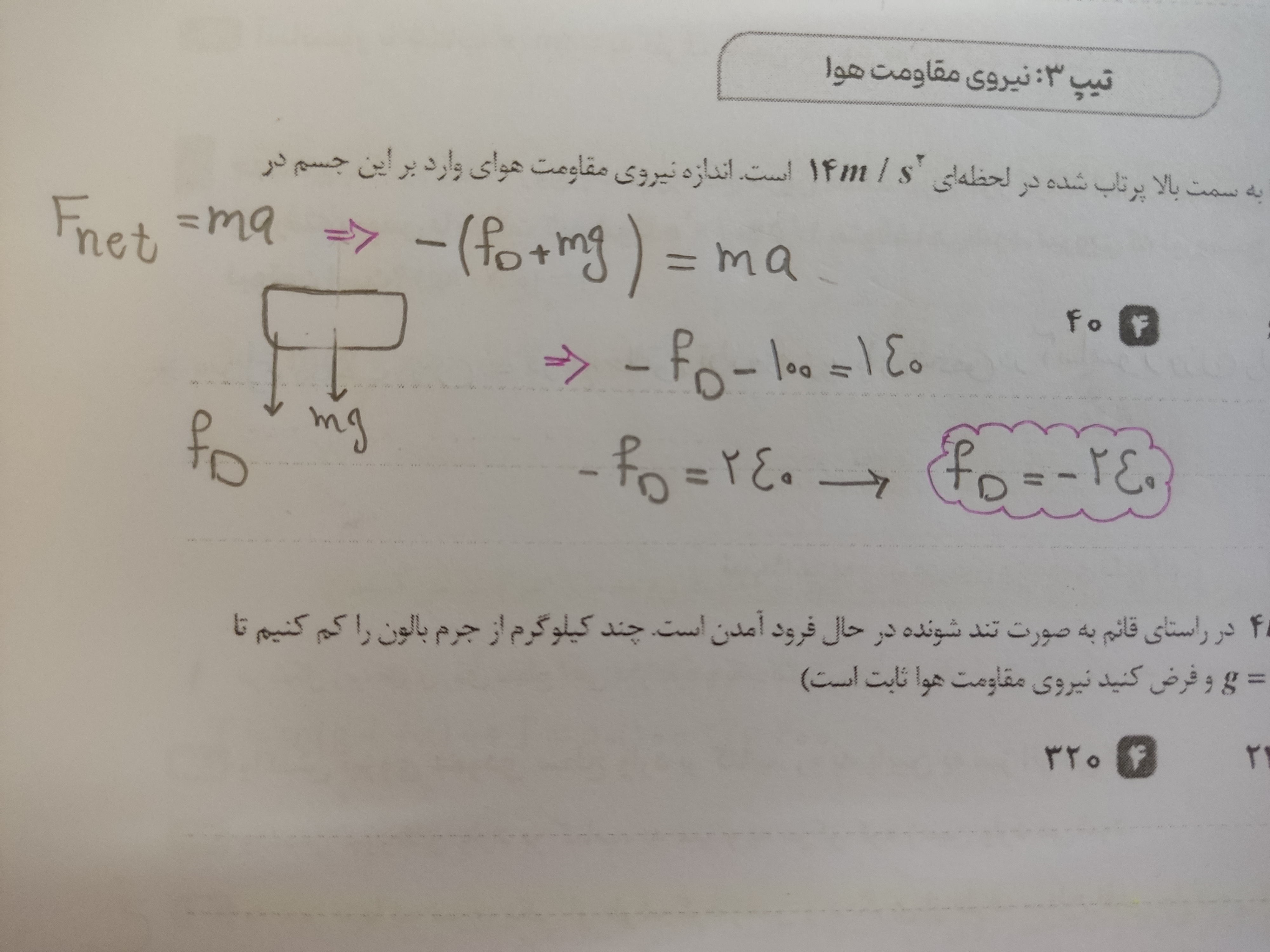 سلام ما تو فیزیک دهم میگفتیم F net میشه نیرو های موافق منهای نیرو های مخالف . یا بیان دیگه ای که استاد میگفتن ، کی میکشه منهای که نمیزاره . خب الان ما اینجا نیروی موافق رو به بالا نداریم و فقط دو تا نیروی مخالف داریم ، چرا ( mg + FD + ) شد ؟؟؟ چرا علامتاشون منفی نمیشه ؟