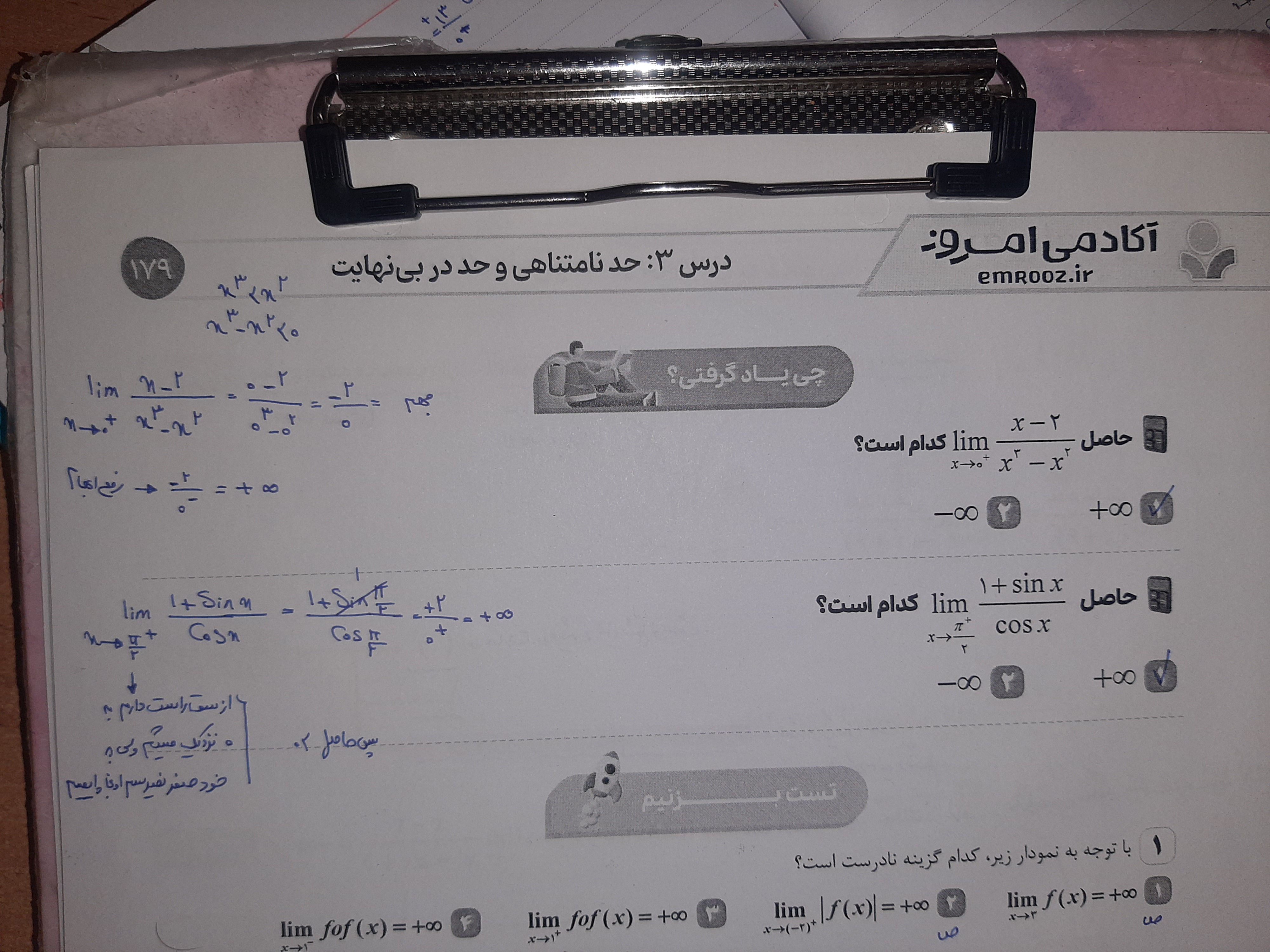 اولی چون اعداد بین صفر و یک اگه به توان بیشتری برسن کوچیک تر میشن، مخرجش میشه صفر منفی و صورتش هم که صفر بذاری عدد منفی 2 بدست میاد پس کلا میشه مثبت بی نهایت دومی صورتش مثبت 2 میشه مخرجش رو روی نمودار کسینوس یا دایره مثلثاتی برسی کنی میبینی بعد 90 درجه کسینوس منفیه پس مخرجش میشه صفر منفی پس کلا میشه منفی بینهایت
