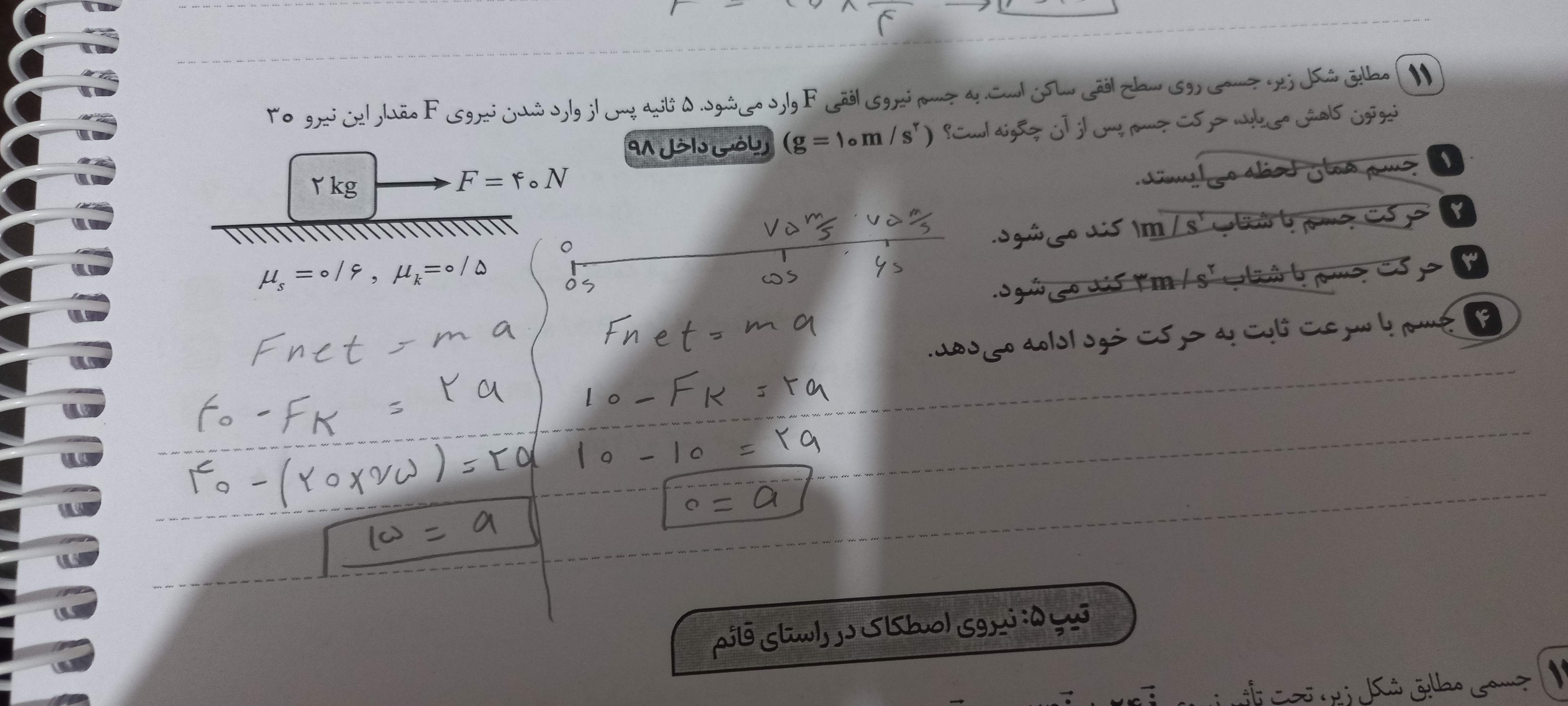سلام وقتی جسم حرکت میکنه که ما دیکه fsmax یا fs نداریم فقط fk داریم که با نیروی ده نیوتن ما برابره