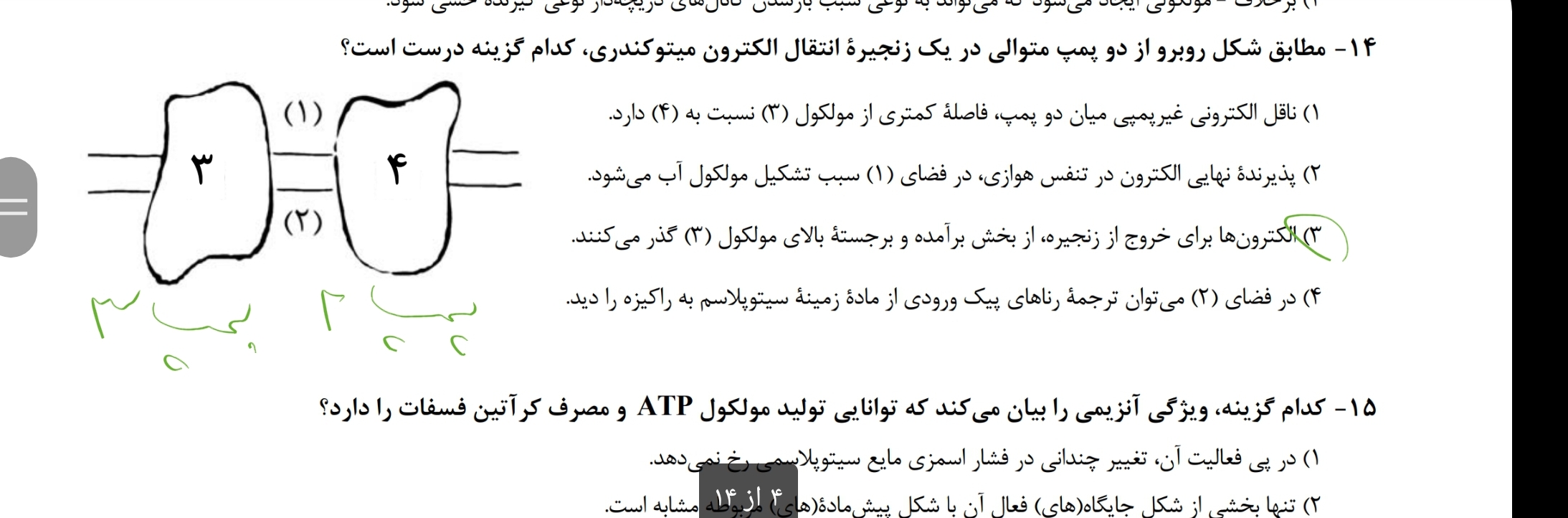 به نظر من گزینه دو میشه چون پذیرنده نهایی e اکسیژنه که تو فضای یکه و باعث تشکیل آب میشه سه غلطه چون باید از بخش برجسته بالای مولکول ۴ گذر کنه!نه سه!