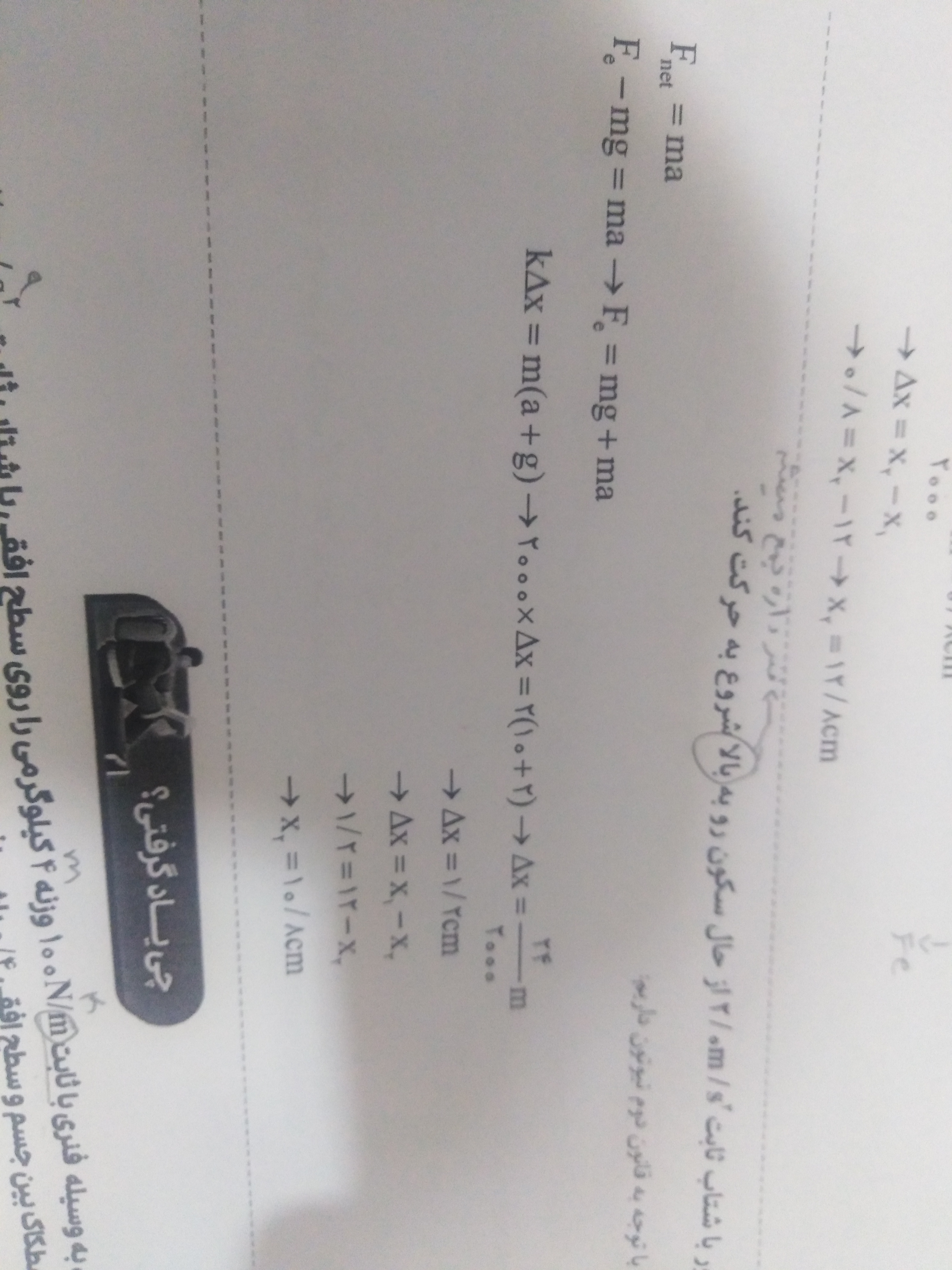 سلام مگه طول اولیه فنر 20 نیست ؟وقتی وزنه رو بهش آویزون میکنیم افزایش طول داره میشه 24 بعد وقتی آسانسور حرکت میکنه 3.2از طولش کم میشه طول فنر میشه20.8