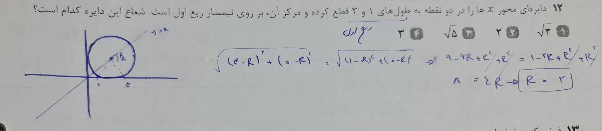 سلام من قبل اینکه حل سوال رو ببینم مرکز دایره رو با این فرض ک دایره چون از محور ایکس ها دونقطه رو قطع کرده و حتما روی نیمسازه دو درنظر گرفتم دلیلم هم این بود ک نقطه و ۱و۱ و نقطه ۳و ۳ که مرکز نیست قطعا بیشتر از ۳ و۳ هم ک نمیتونه باشه پس ی چیزیه بینش ک میشه ۲ و۲ درسته؟