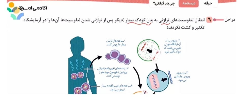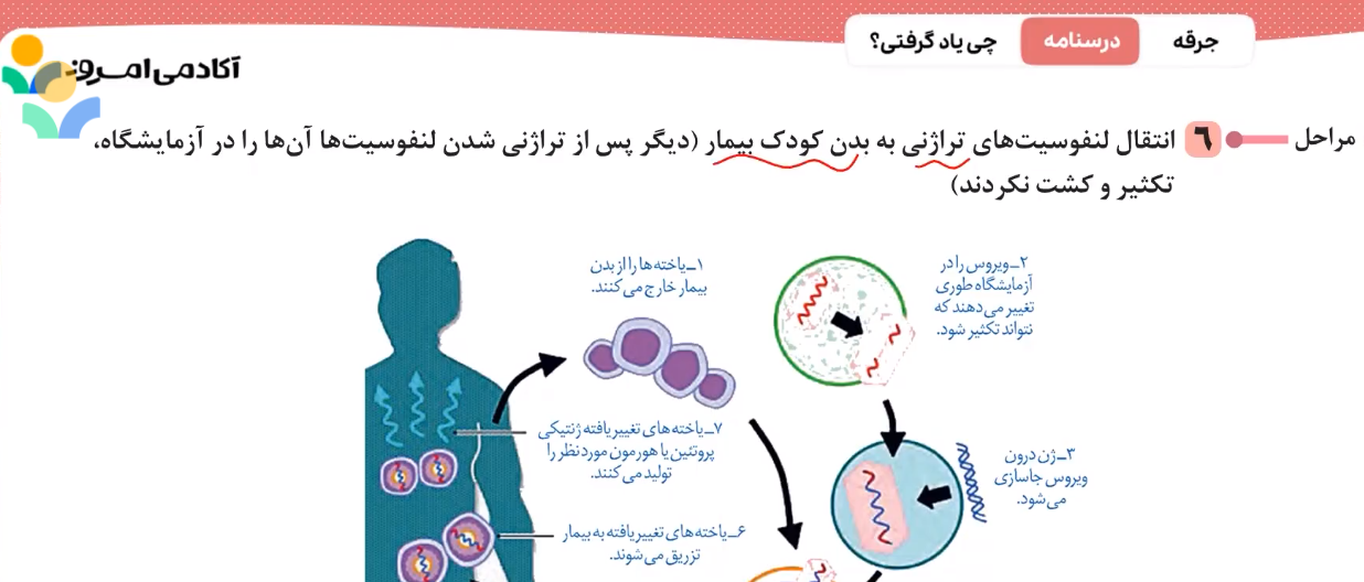 سلام درواقع تو مرحله پنجم، کشت رخ میده و تو مرحله ششم که انتقال یاخته تراژن به بدنه، طبق جزوه، کشت و تکثیر لنفوسیت نداریم درسته؟