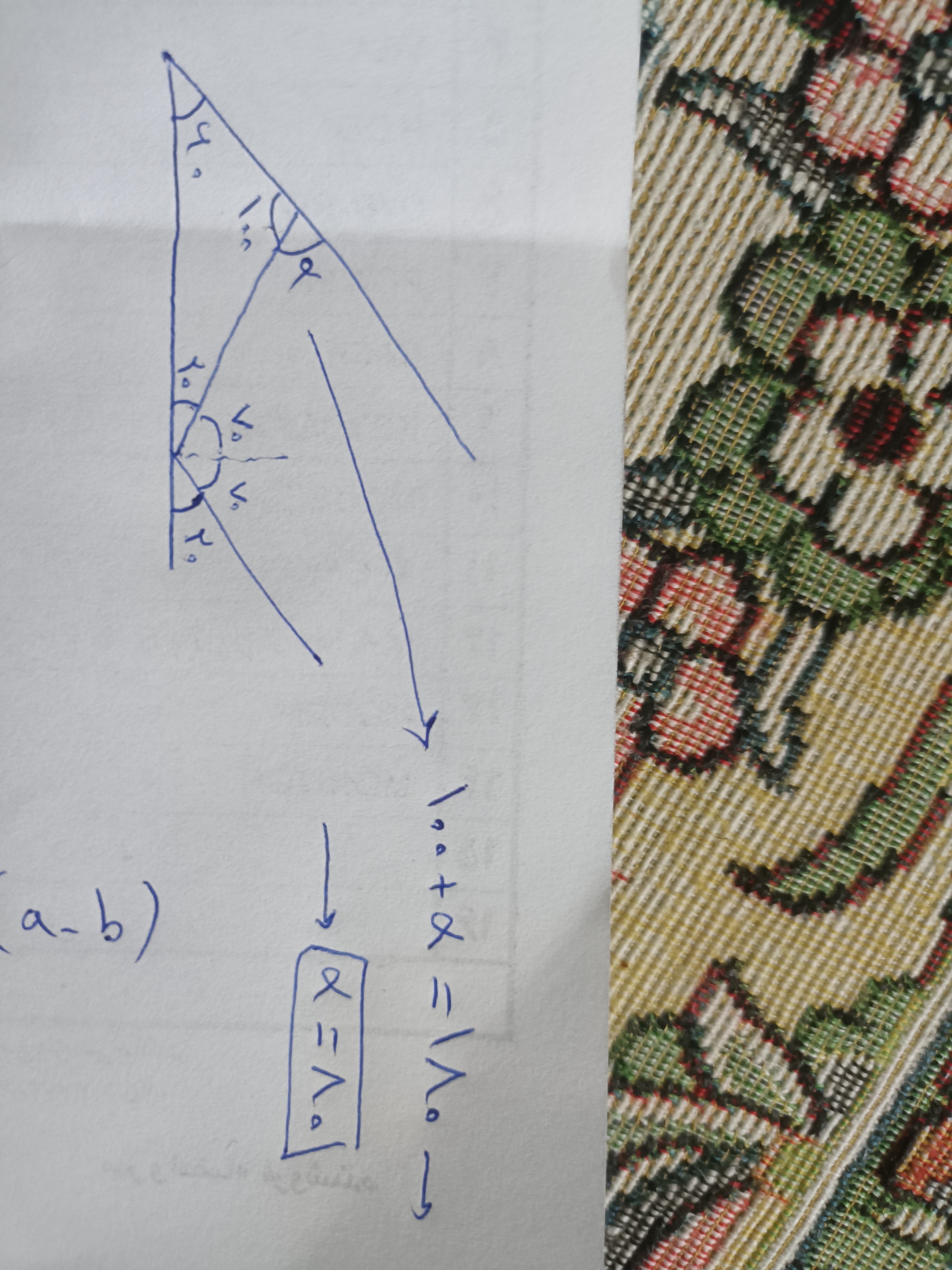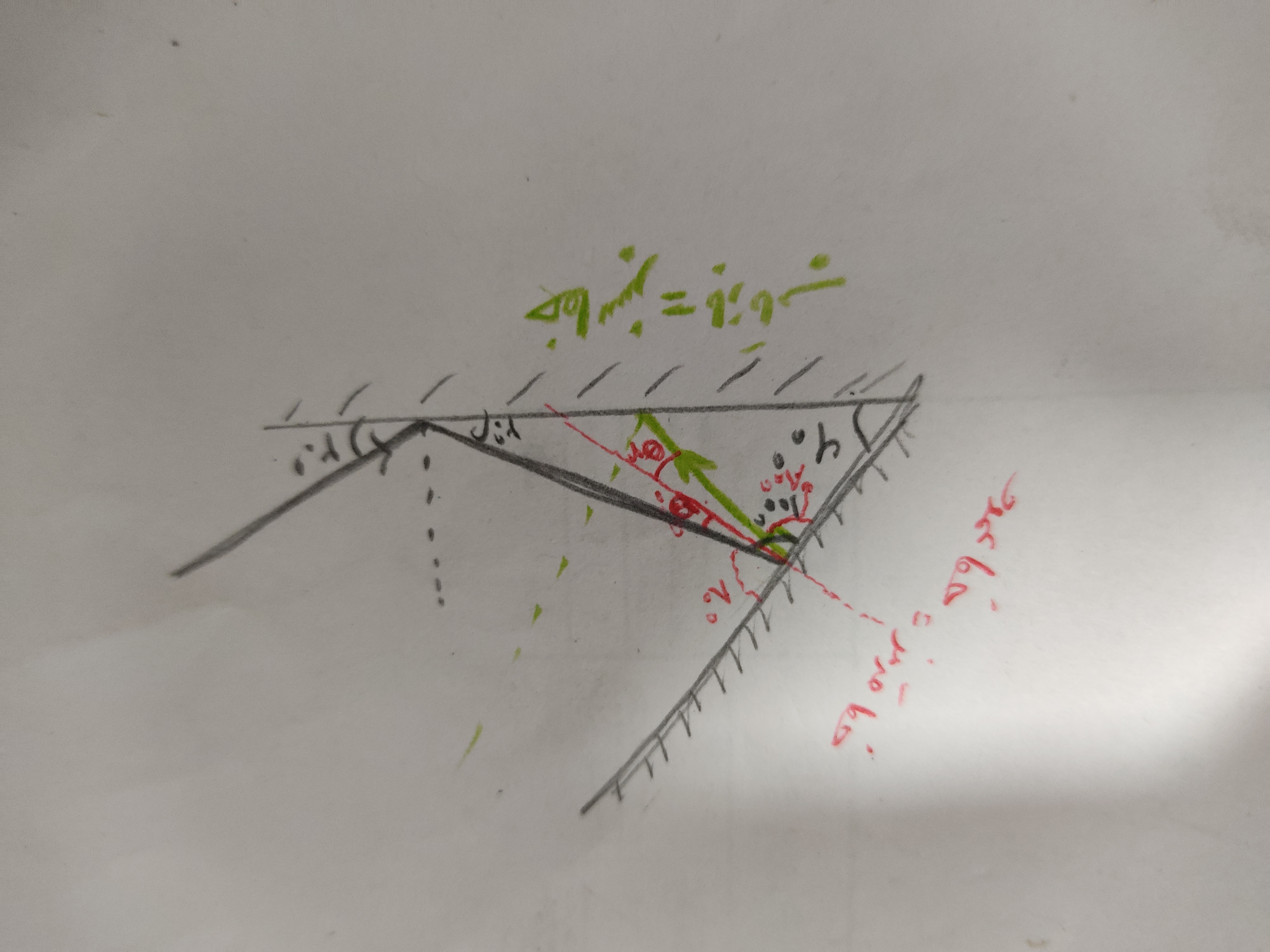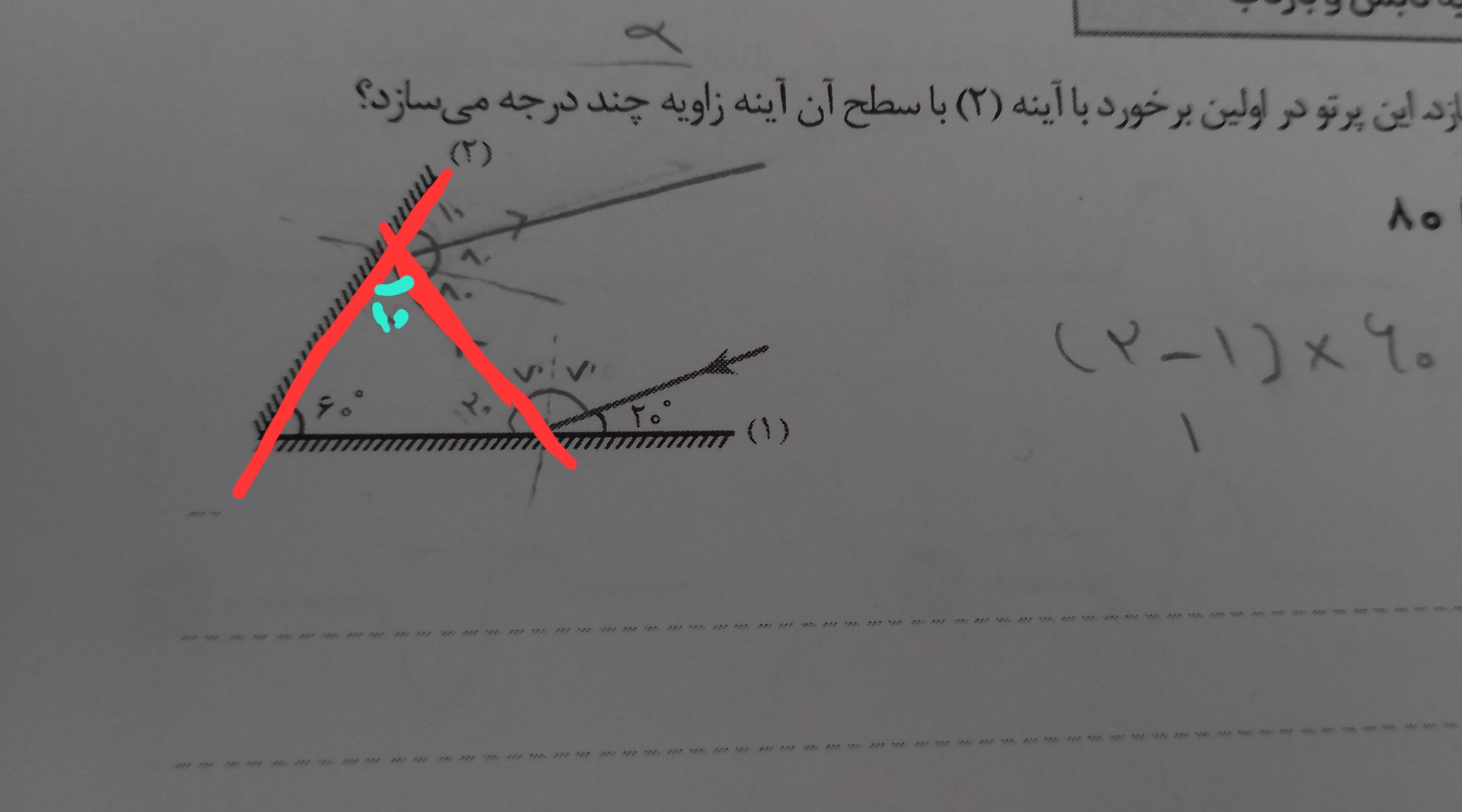 @حسین صادقی سلام رفیق وقت بخیر نیازی نیست بنظرم مجموع زاویه ها 180 تا ک 20+60 رو داریم ازش پس زاویه سوم همون جور ک انتظار داریم 100 درجه میشه و وقتی زاویه فرعی رو طبق حرف استاد که خواسته سواله میخوایم در واقع زاویه متمم 100 درجه توی نیم صفحه اونجور ک بخوای خط عمود به آینه دوم رو بکشی ی 90 تا داری و یدونه60 تا که گفته خودع سوال پس در نتیجه زاویه سوم میشه 30 درجه ک قابل قبول نیست وقتی زاویه های بنام الفا (همون 20 درجه ها) باید باهم برابر باشن