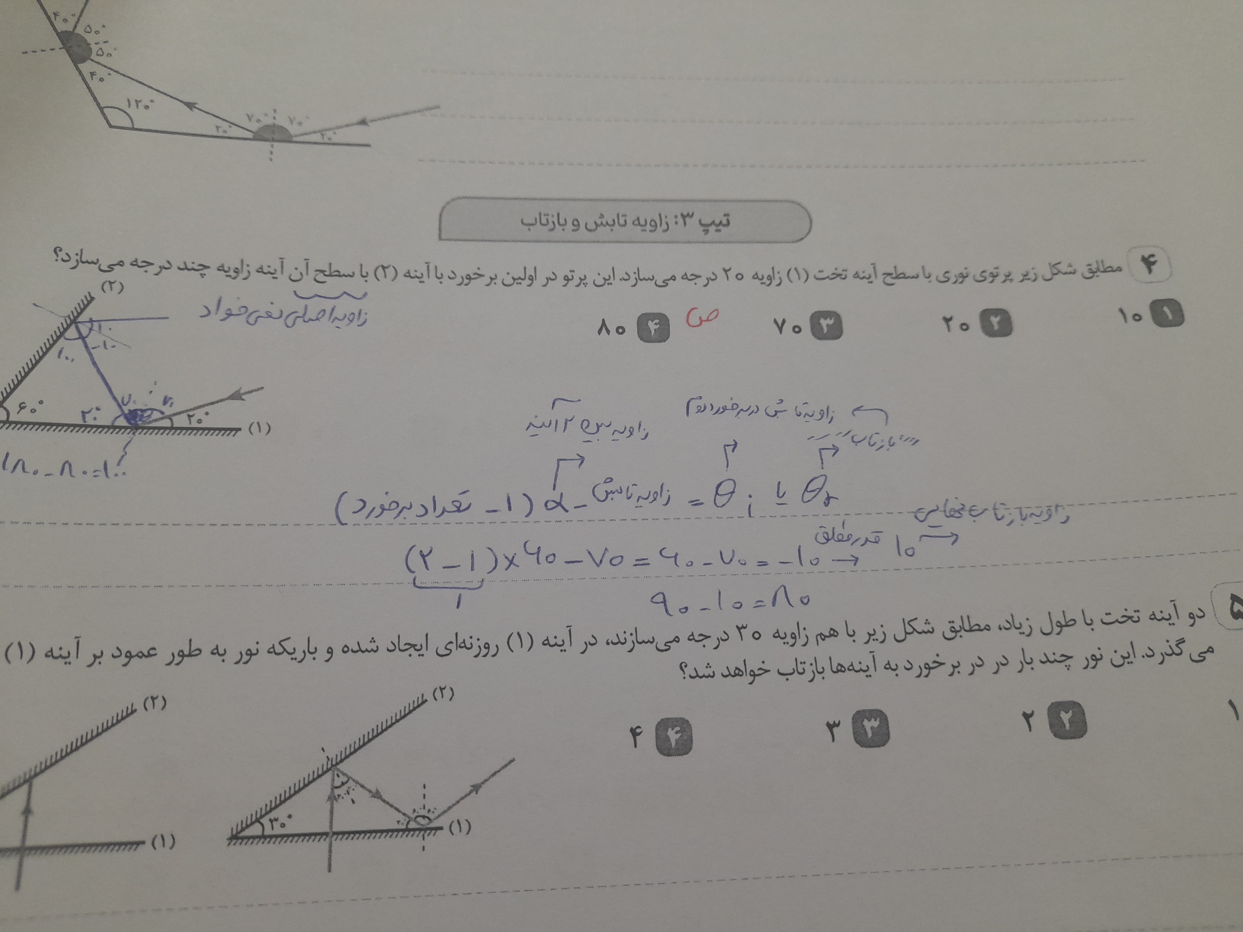سلام یکی از تیپ های مهم و مفهومیه این تست و بنظرم واسه اموزش بدترین کار اینه ک با روش تستی حل کنن روش تستی اگر در کنار روش کتاب و رسم توضیح داده بشه خیلی هم خوبه ولی استاد این نکته رو رعایت نمیکنه اصلا ایراد شما هم اینجاست که وقتی اون زاویه 100 درجه درست میشه یعنی اون پرتو به سمت اینه 1 برمیگرده و برخورد سومشو انجام میده شما اشتباها پرتو رو بعد از اون 100 درجه به سمت خارج اینه ها رسم کردی