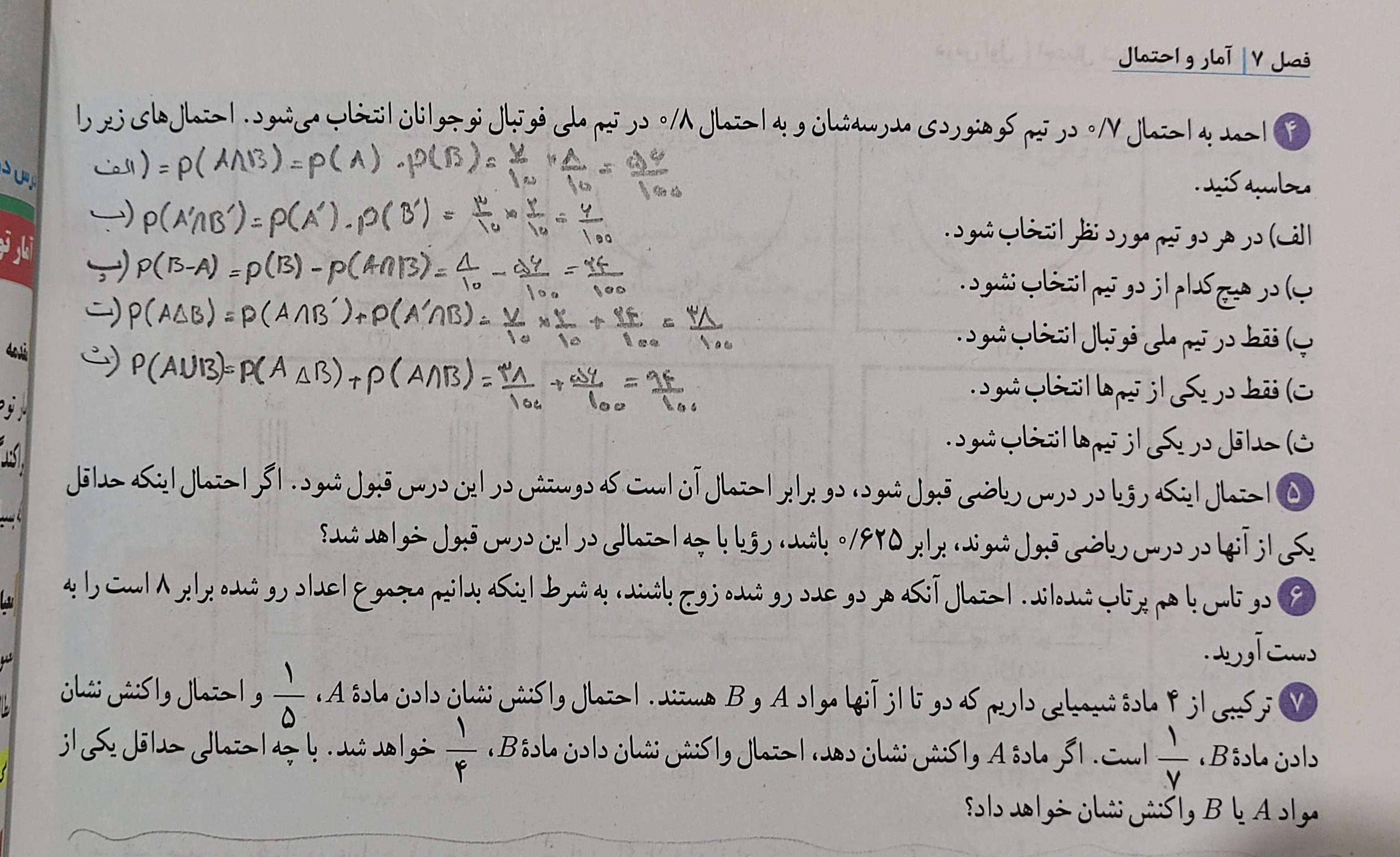 سلام ببخشید استاد کجای تدریسشون سوالات حداقل و حداکثر احتمال رو حل کردن ؟؟؟؟ نصف بیشتر سوالات کتاب، توی بخش احتمال گفته اگه احتمال چیزی انقدر باشه ، در چه صورت رخ میدهد ، نمی‌دهد ، هردو رخ میدهد ، فقط یکی رخ میدهد ، ولی استاد اصلا راجب اینجور سوالات حرف نزدن یا من هیچ ویدئویی در این باره ندیدم ، میشه بگید کجا توضیح دادن ؟؟ نمونه سوالات کتاب رو براتون عکسش رو میزارم لطفا بگید این نوع سوالات تو کدوم ویدئو حل شده 🙏🏻